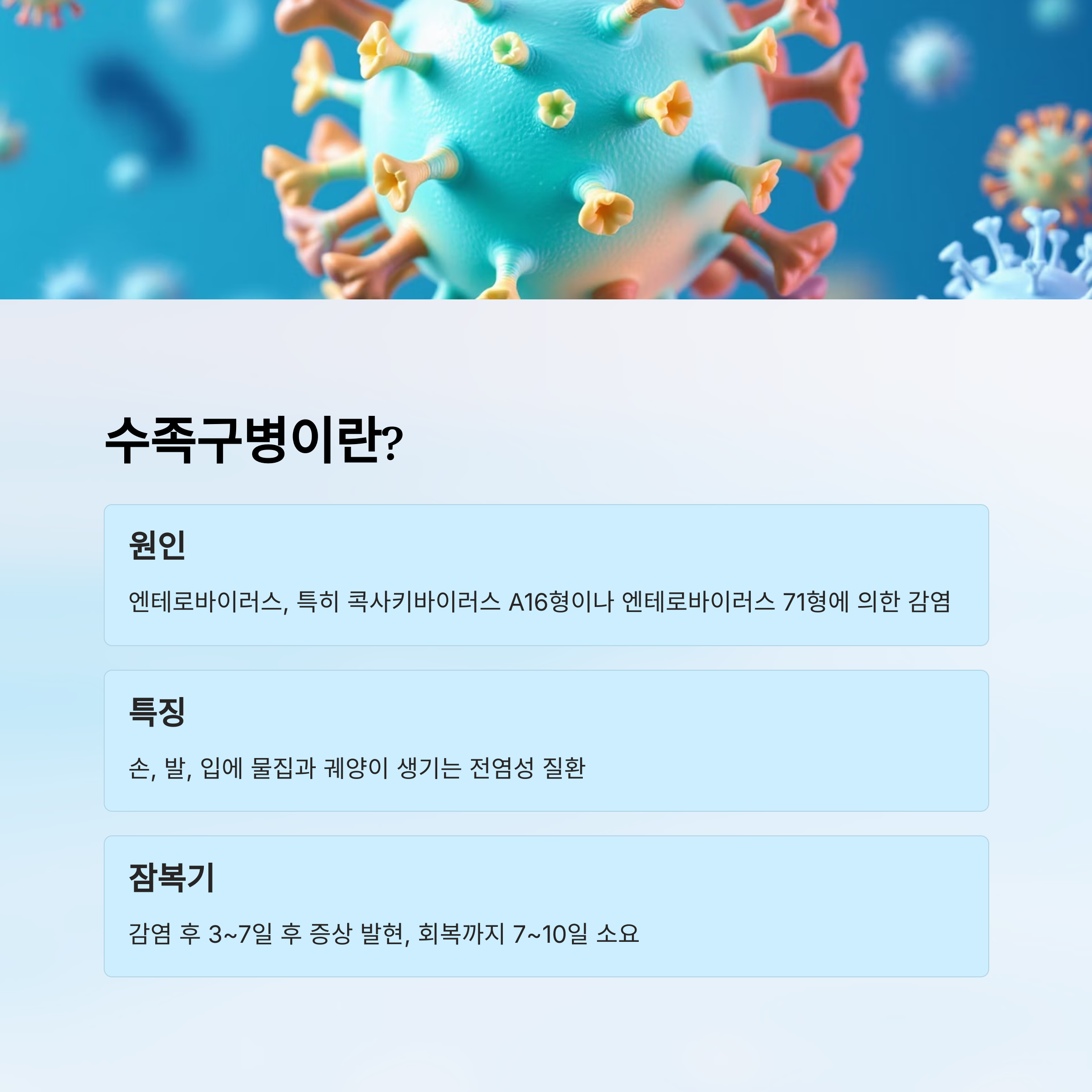 수족구병은 주로 엔테로바이러스(Enterovirus), 특히 콕사키바이러스 A16형이나 엔테로바이러스 71형에 의해 발생하는 전염성 질환이에요. 이름 그대로 손(수), 발(족), 입(구)에 특징적인 발진이나 물집이 생기는 것이 대표적인 증상이죠.