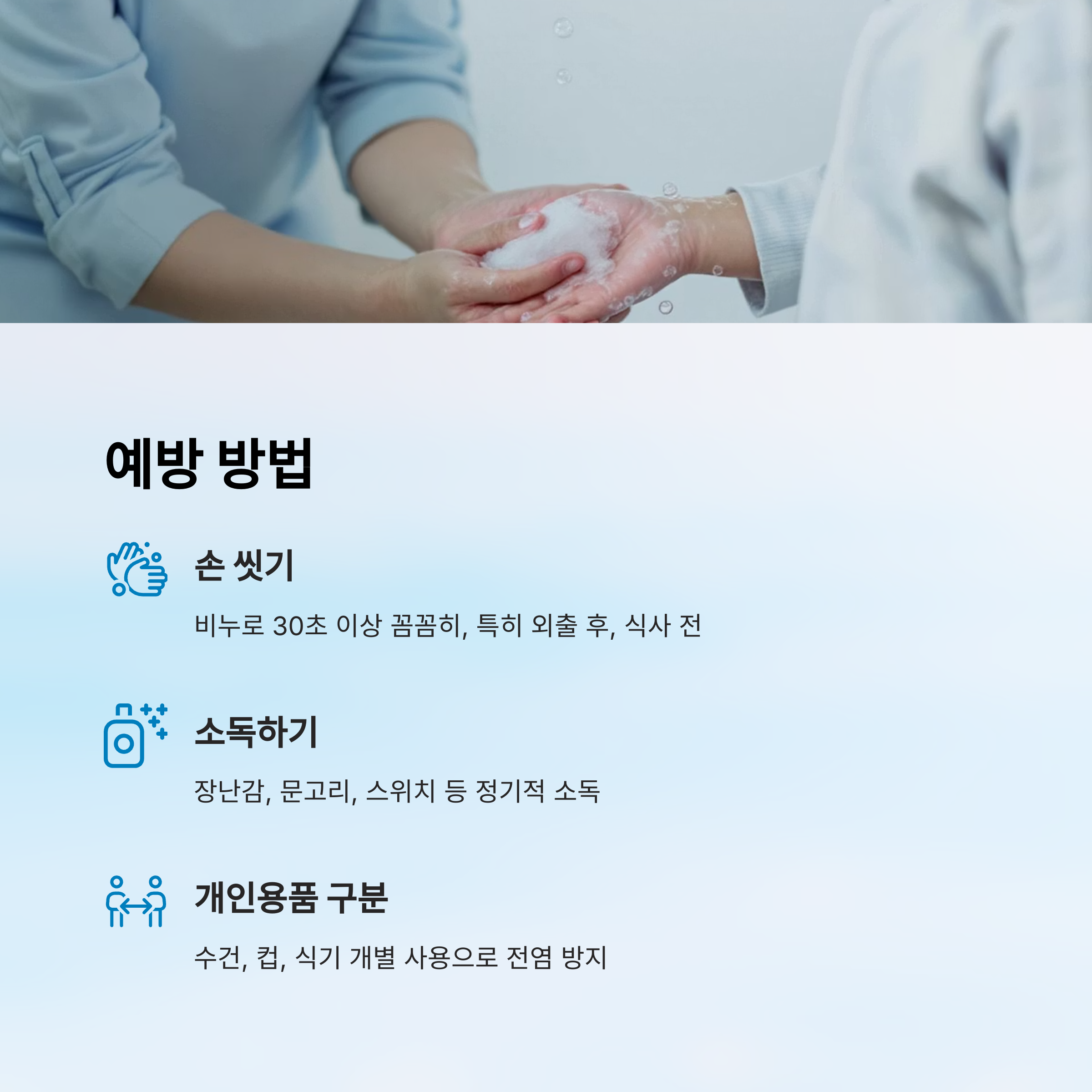 감염자가 있는 경우, 물컵, 수건, 이불은 반드시 따로 사용해야 해요. 빨래할 때는 고온으로 세탁하고, 일광 소독까지 하면 완벽해요. 집에서는 수시로 문고리, 리모컨, 휴대폰처럼 손이 자주 닿는 곳을 소독해 주세요. 작은 습관이 큰 차이를 만들어요.