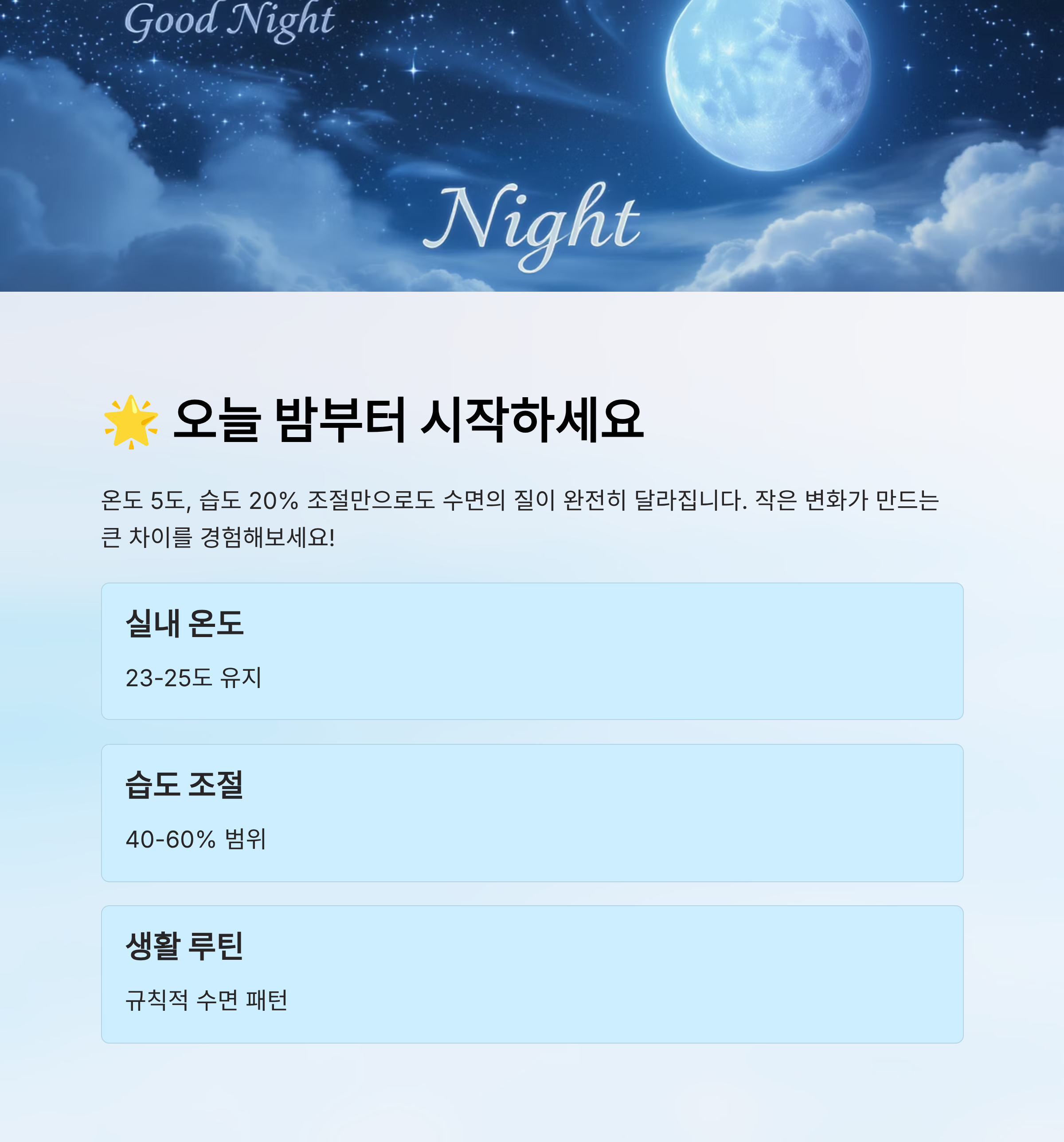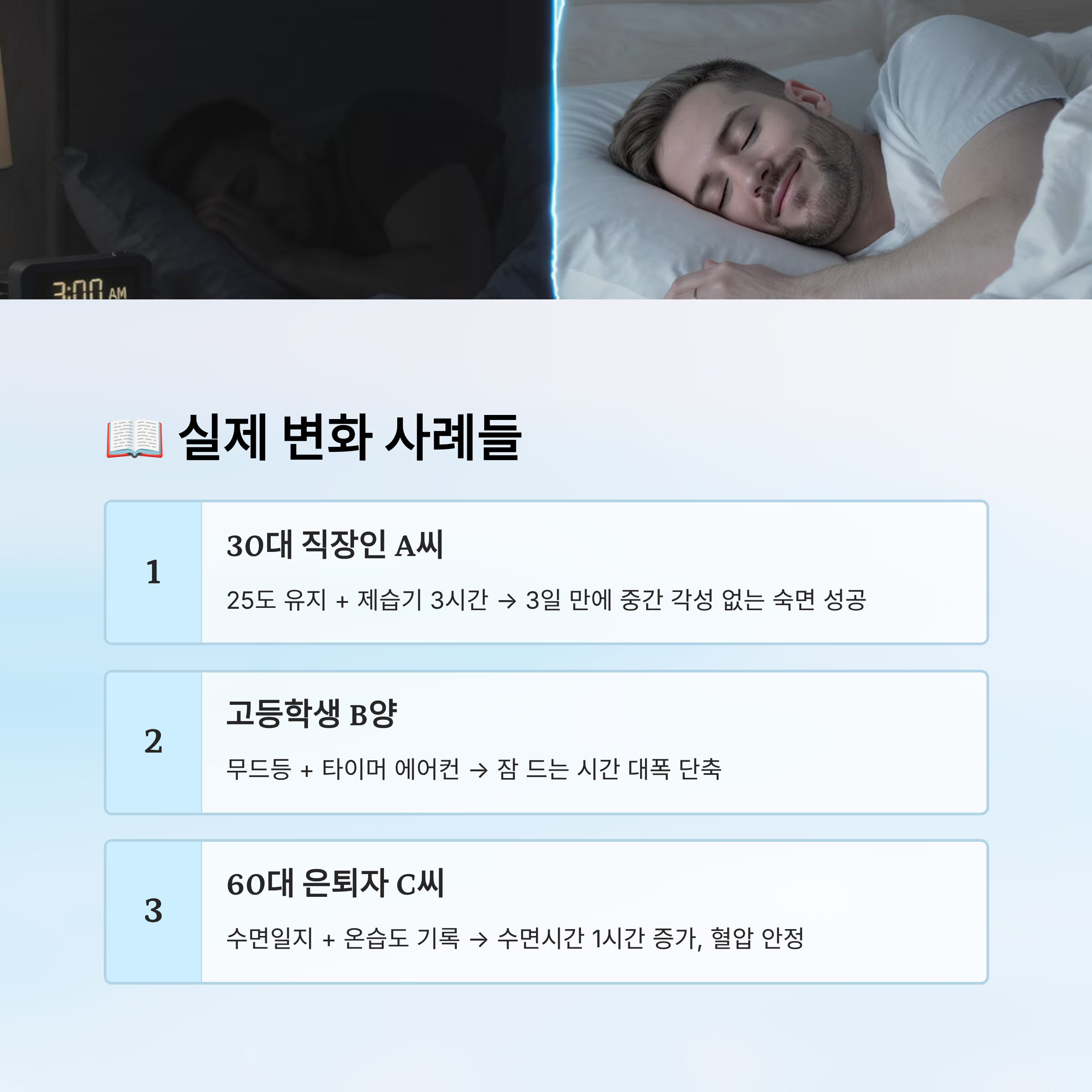 | A씨 (30대 직장인) | 자주 깨고 피곤함 지속 | 온도 25도 유지 + 제습기 사용 | 중간 각성 없음, 숙면 성공 |