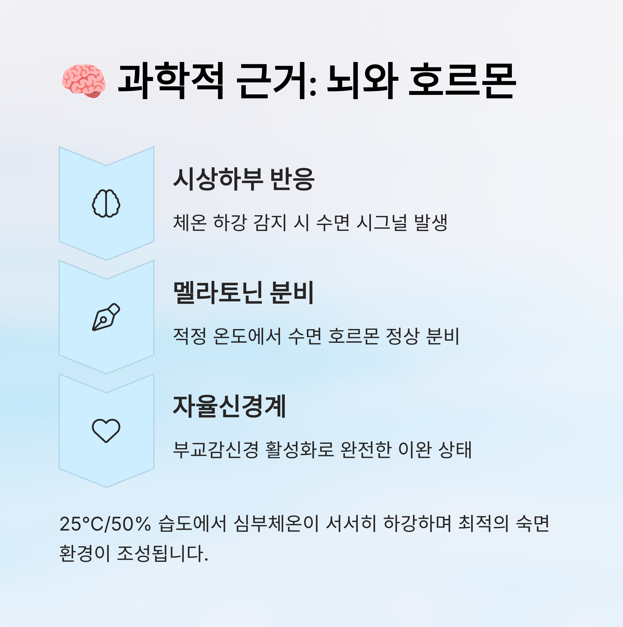 | 25℃ / 50% 습도 | 서서히 하강 | 정상 분비 | 부교감 우세 | 깊은 수면 |