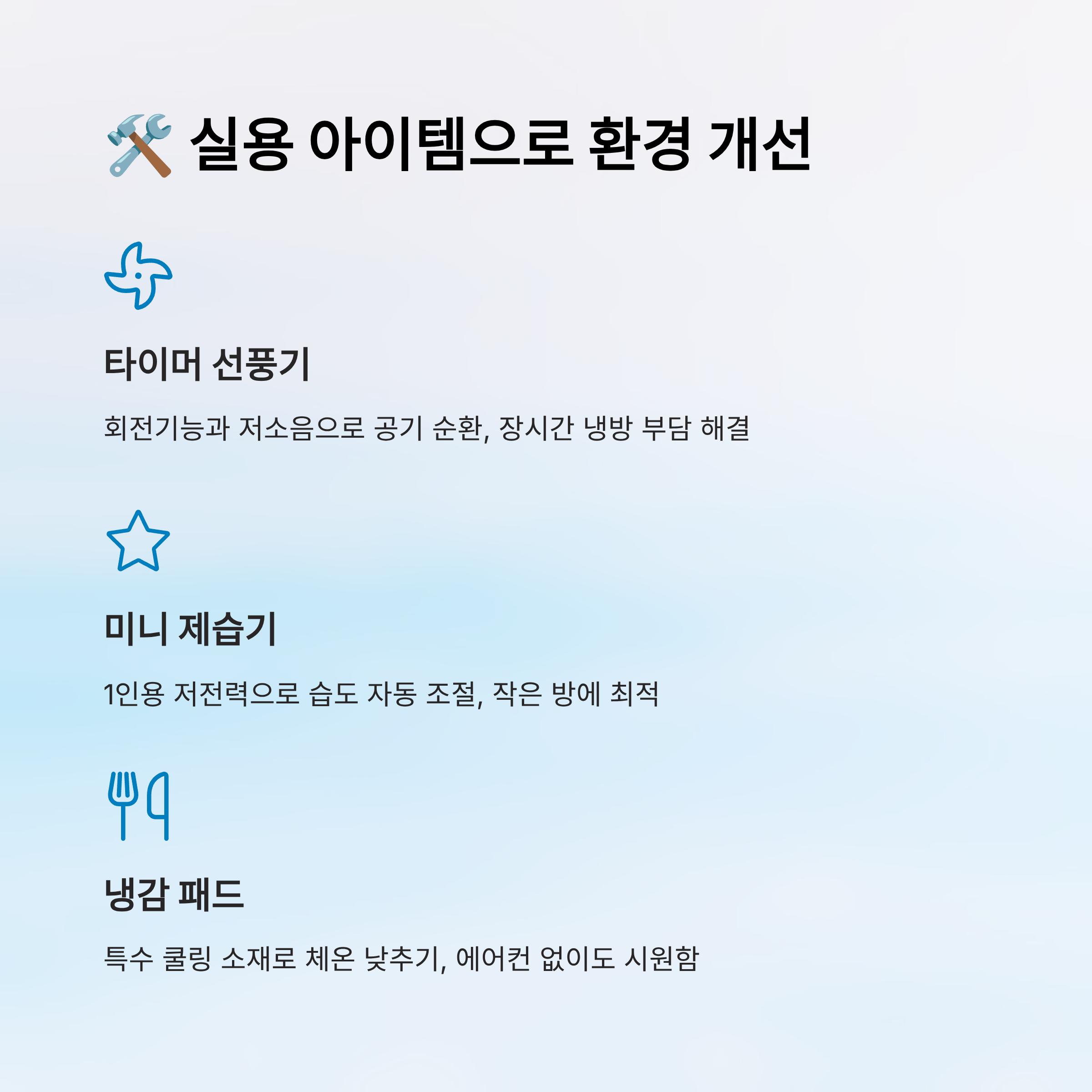 | 타이머 선풍기 | 공기 순환 | 회전기능, 저소음 | 장시간 냉방 부담될 때 |