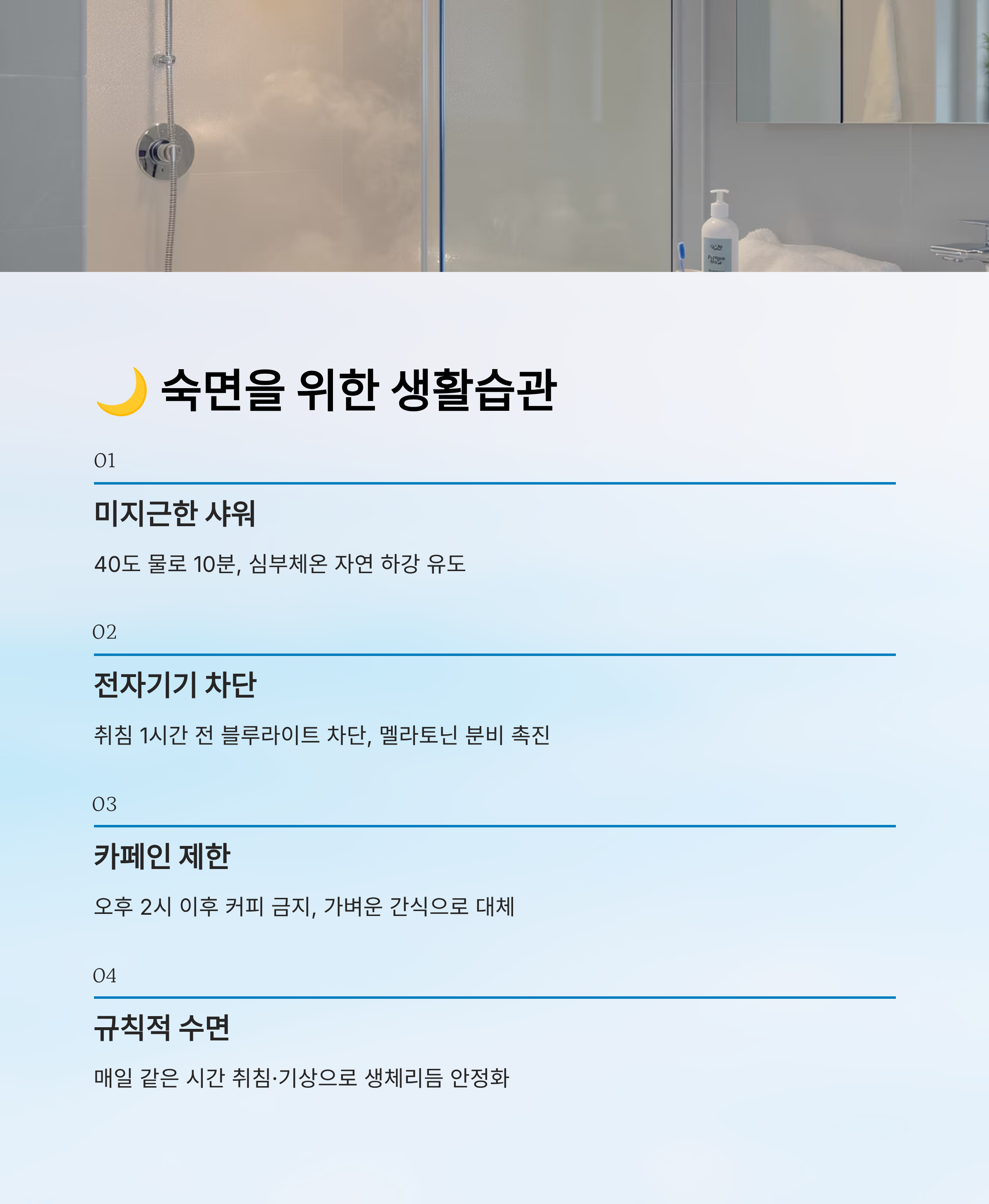 | 취침 전 샤워 | 40도 미지근한 물로 10분 | 찬물 샤워는 피하기 |