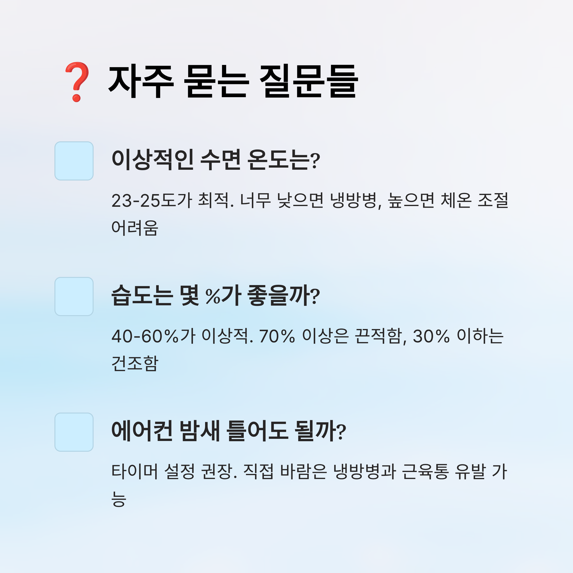 A1. 일반적으로 23~25도가 숙면에 가장 적합한 온도예요. 너무 낮으면 냉방병이나 근육 수축이 생길 수 있고, 너무 높으면 체온이 떨어지지 않아 잠들기 어려워요.