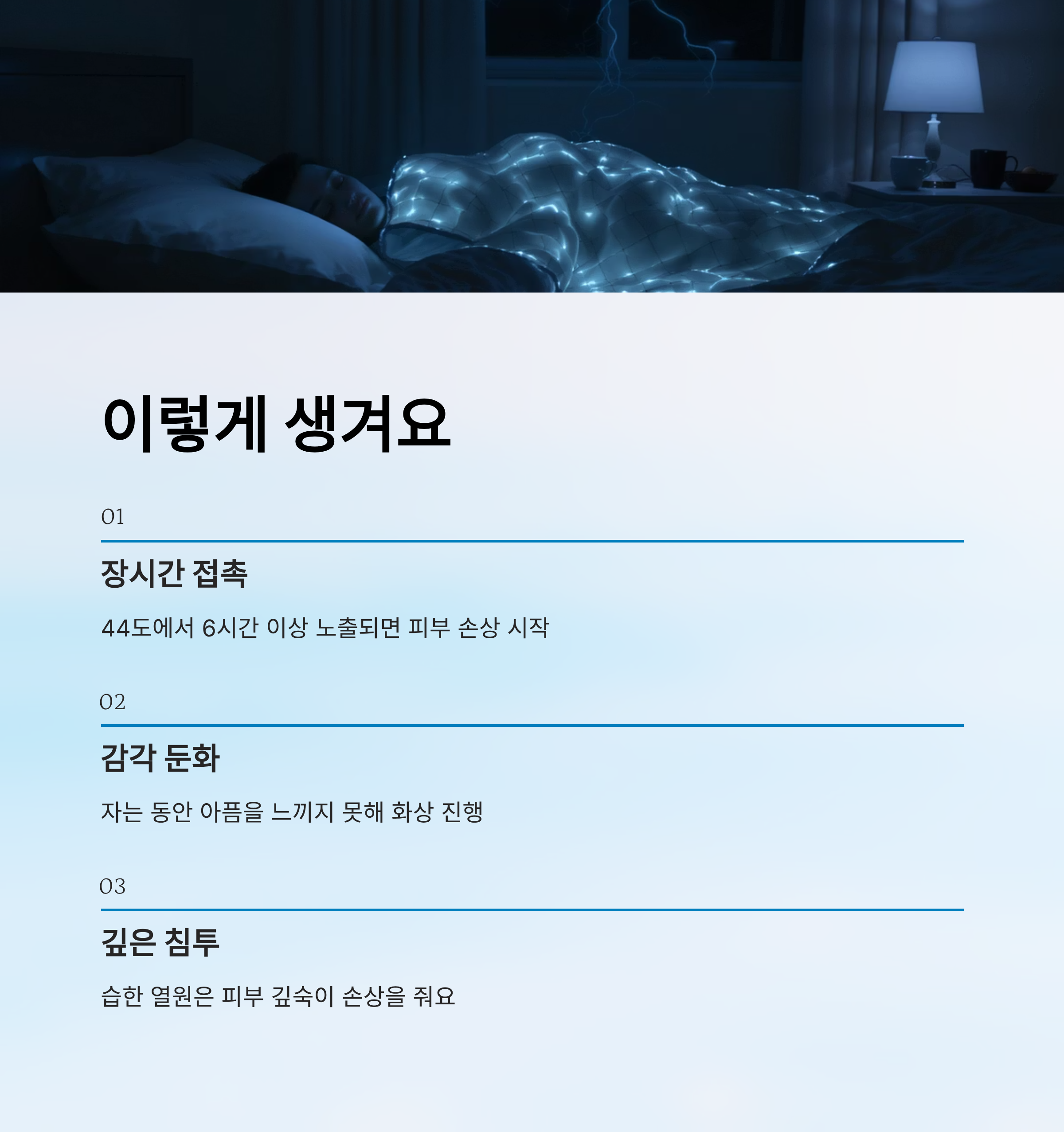 사람들이 흔히 놓치는 것은 바로 “느껴지지 않게 다가오는 화상”이라는 점이에요. 특히 잠잘 때 전기장판을 켜놓고 자거나, 핫팩을 피부에 직접 닿게 사용하면 자는 동안 화상을 입을 수 있어요. 피부는 장시간 온도에 노출될수록 감각이 무뎌지기 때문에 아프다는 느낌 없이도 화상이 발생할 수 있답니다.