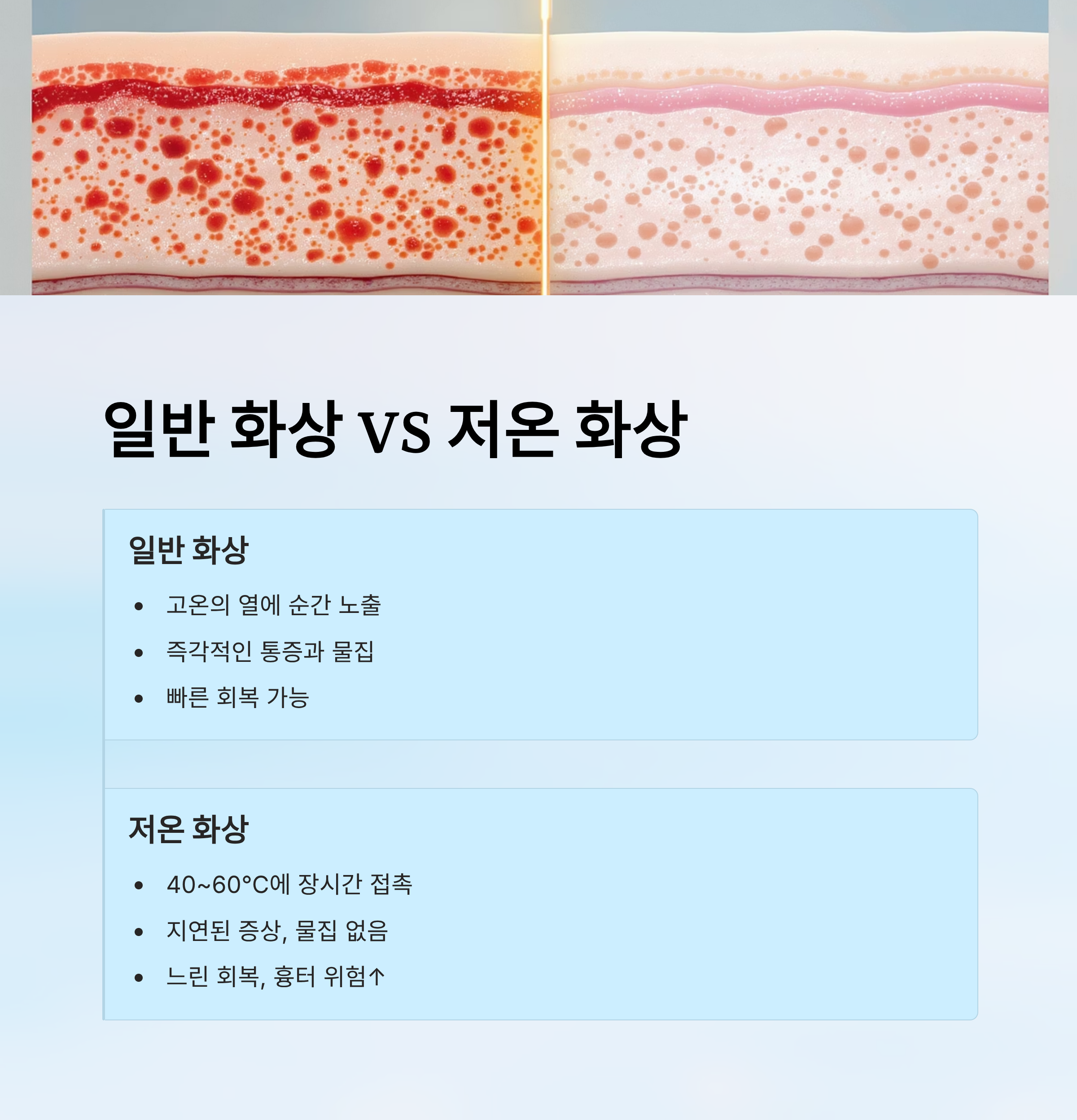 일반 화상은 순간적으로 강한 열에 노출되어 피부가 손상되는 반면, 저온 화상은 비교적 낮은 열에 ‘오랜 시간’ 노출되어 발생해요. 이 차이점 때문에 증상도, 대처법도 전혀 다르답니다.