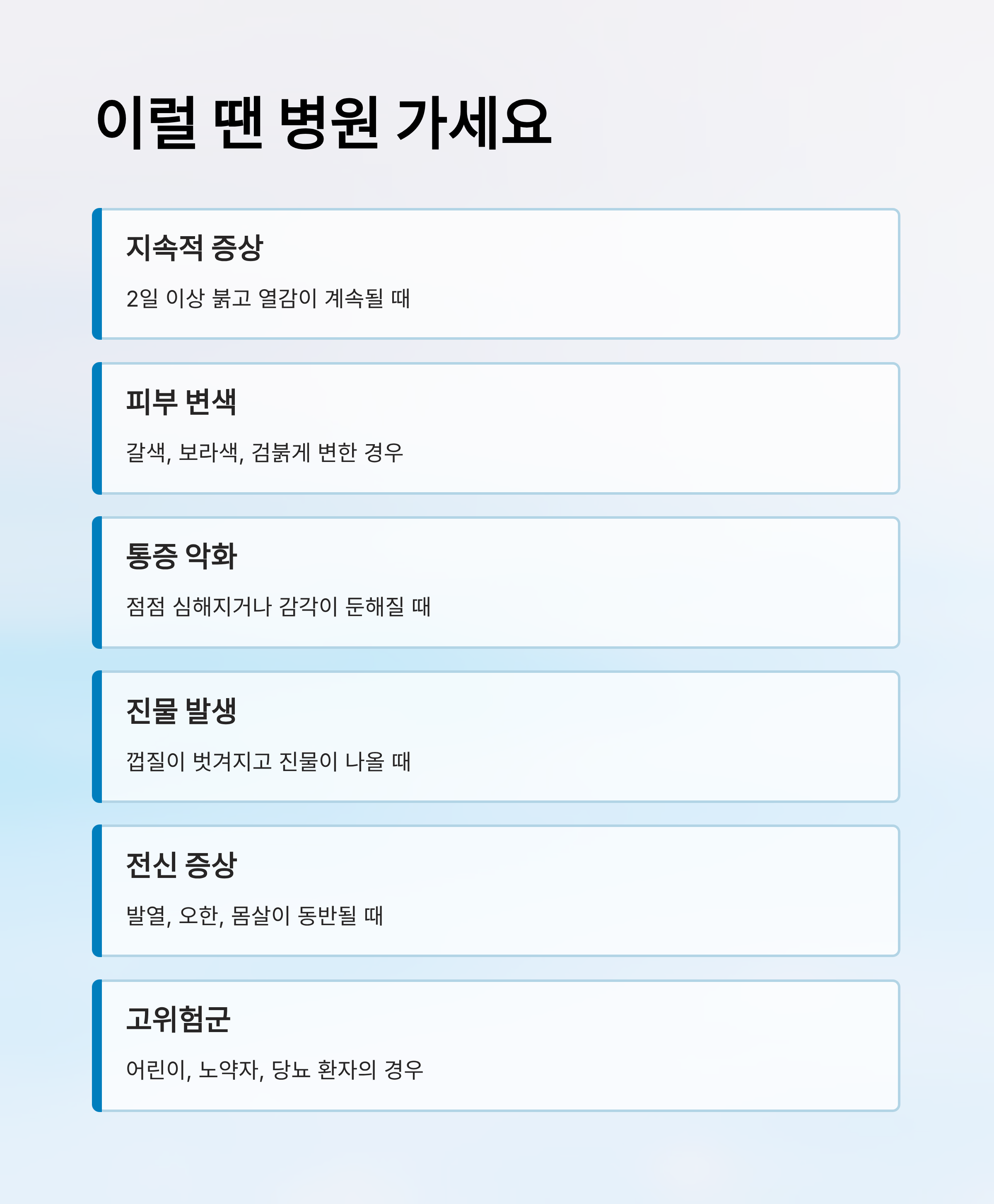 저온 화상은 방치하면 흉터가 남거나 감염으로 이어질 수 있어서, 정확한 시기에 병원을 찾는 게 중요해요. 특히 아래와 같은 증상이 보인다면 즉시 병원을 방문하는 것이 좋아요.