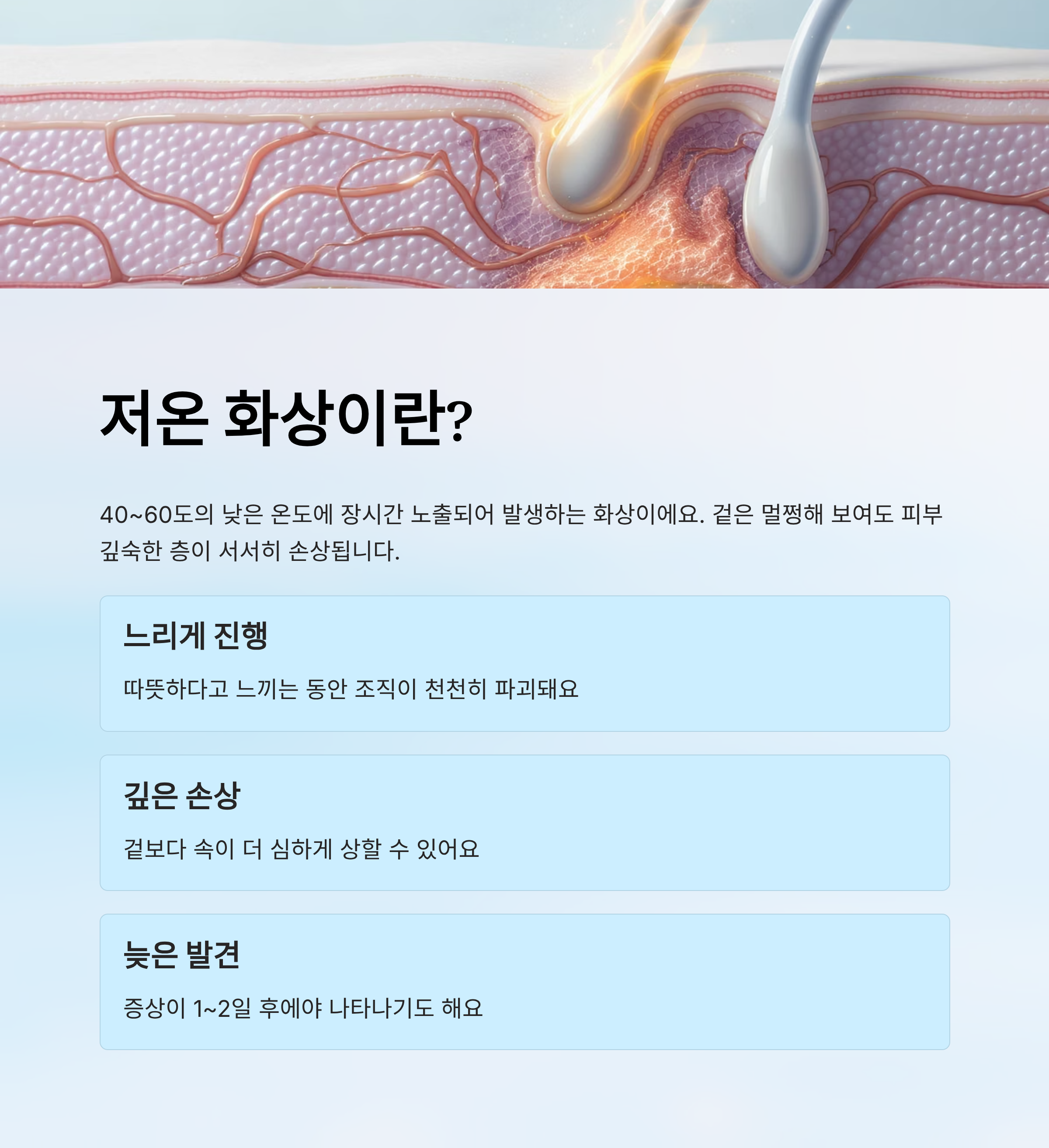 저온 화상은 40~60도 사이의 비교적 낮은 온도에 피부가 장시간 노출될 때 발생하는 화상을 말해요. 일반적인 화상처럼 뜨거운 물이나 불에 의해 생기는 것이 아니라, 따뜻하게 느껴지는 열원에 오랫동안 접촉함으로써 생기는 거랍니다. 처음에는 따뜻하고 편안하다고 느낄 수 있지만, 피부 깊숙한 층이 서서히 손상되면서 화상이 진행돼요.