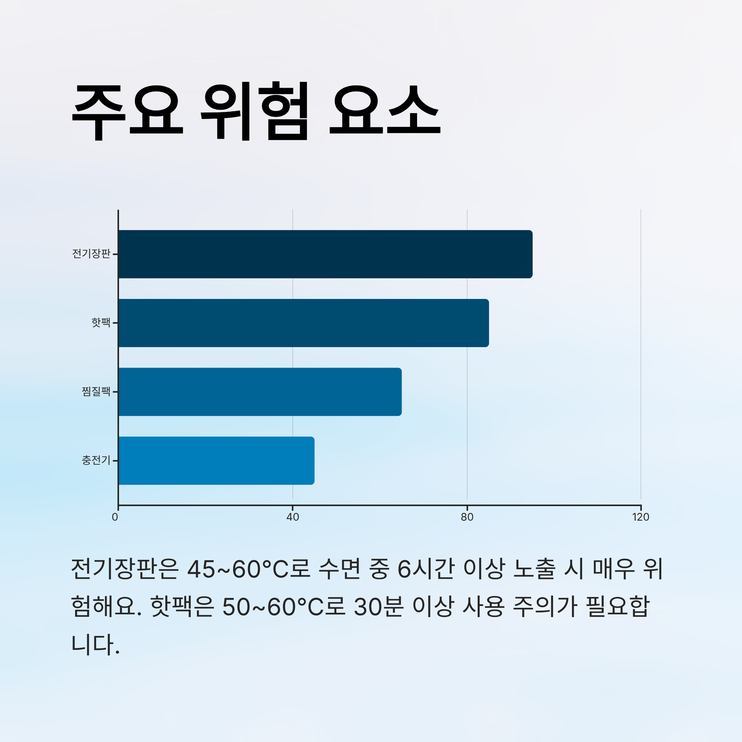 | 전기장판 | 45~60℃ | 수면 중 6시간 이상 | 매우 높음 | 타이머 설정 필수 |