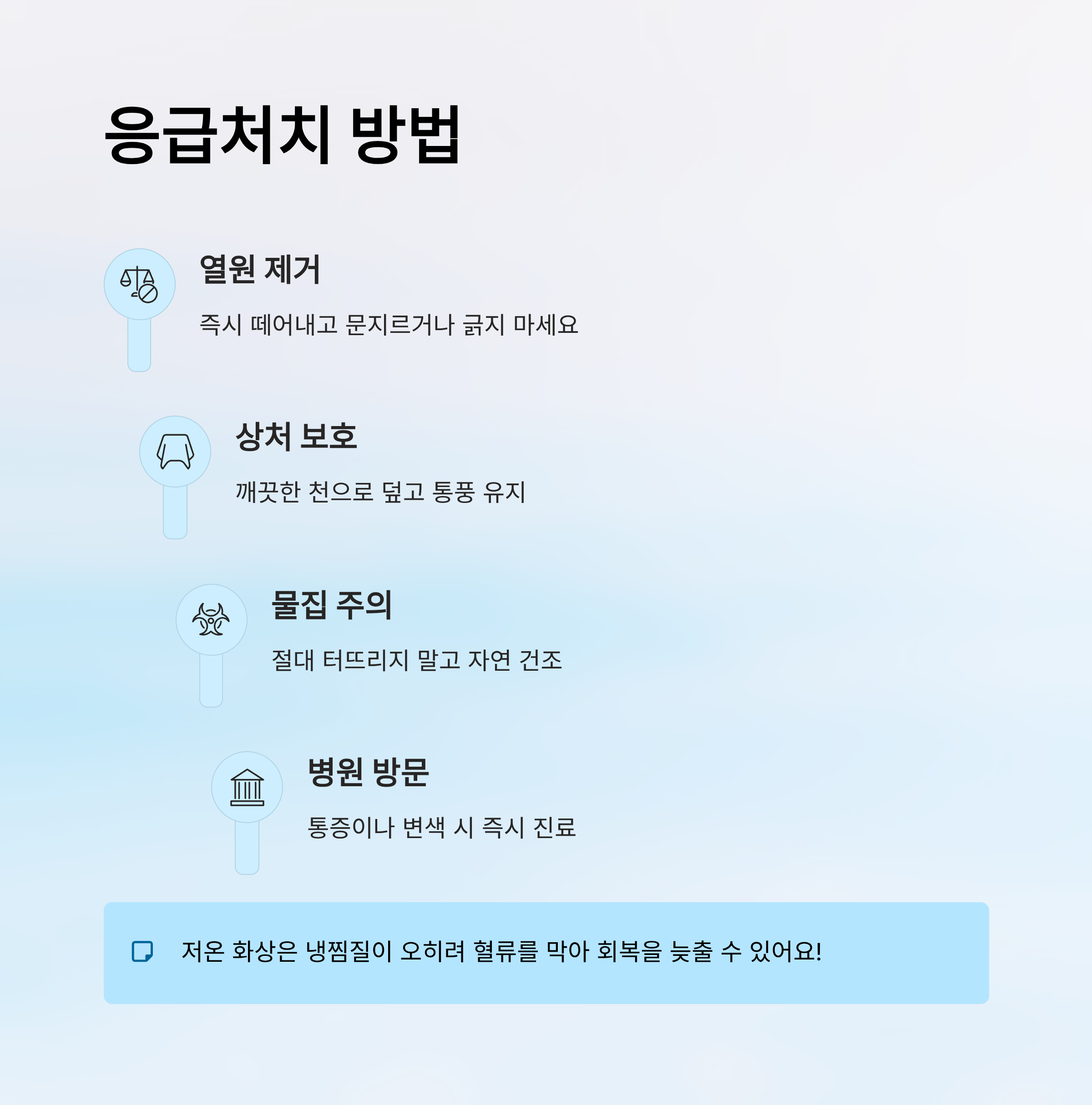 저온 화상은 일반 화상과 달리 ‘냉찜질’이 항상 정답은 아니에요. 이미 피부가 깊숙이 손상됐기 때문에 차가운 자극이 오히려 혈류를 막아 회복을 늦출 수 있어요. 그래서 상황에 따라 대처법이 달라져야 해요.