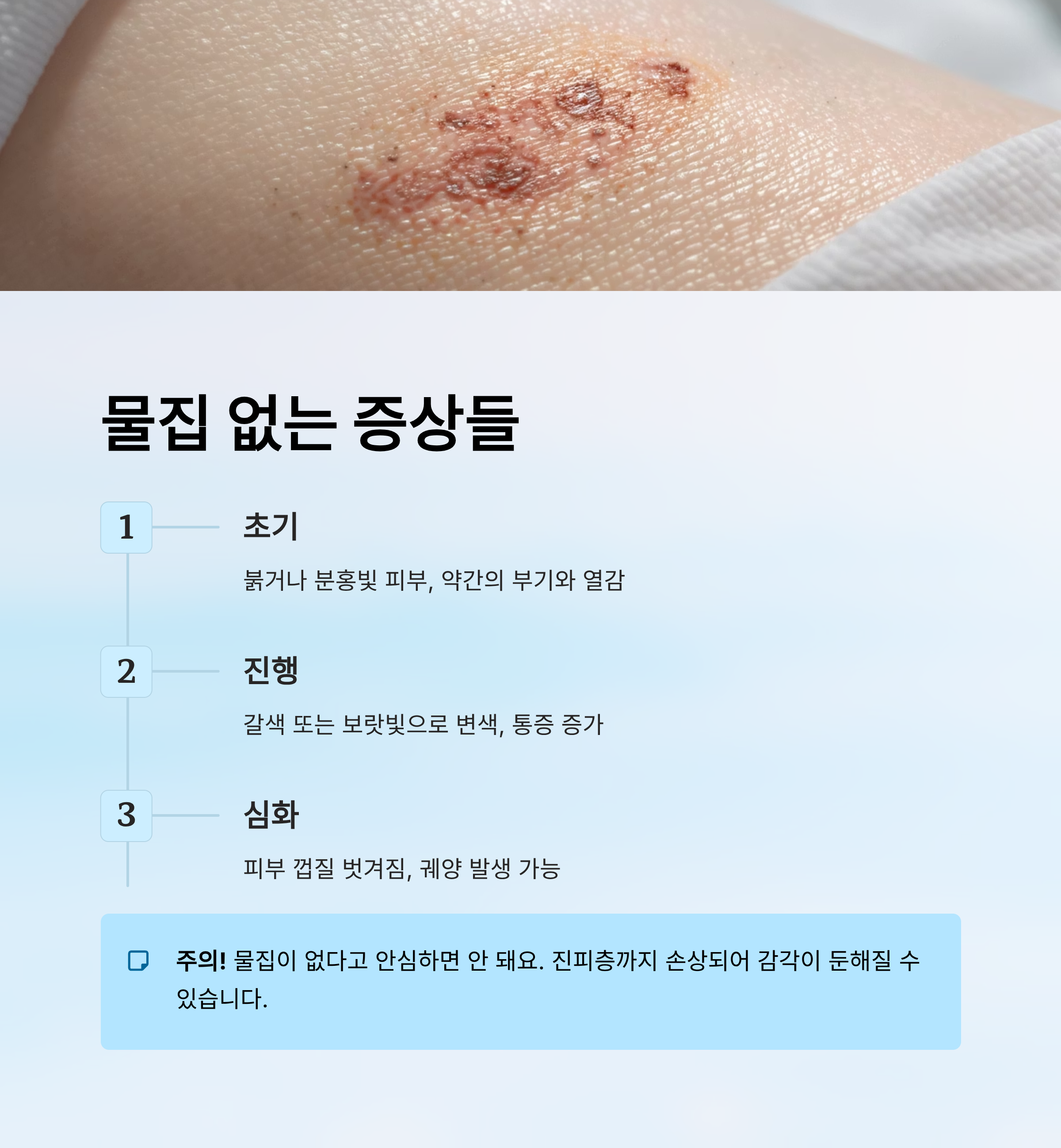 저온 화상의 가장 큰 특징은 “물집이 없을 수 있다”는 점이에요. 그래서 많은 사람들이 ‘화상 아니다’라고 오해하고 그냥 넘어가죠. 하지만 피부 속 조직은 조용히 타들어가고 있을 수 있어요. 증상은 서서히 나타나며, 1~2일 후 통증이 더 심해지기도 해요.