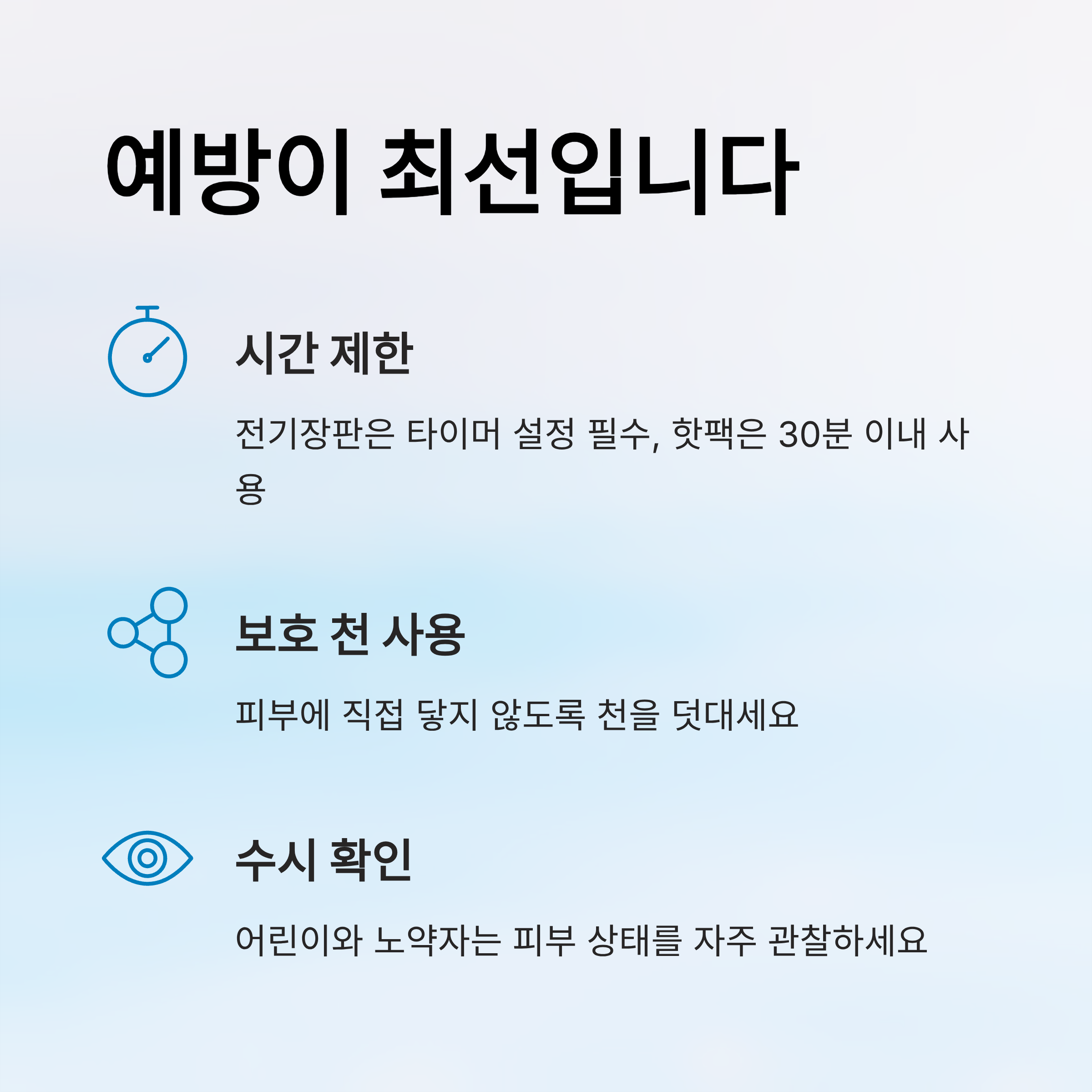 특히 주의할 점은 저온 화상이 피부 깊숙한 진피층까지 손상시킬 수 있다는 점이에요. 겉은 멀쩡한데 속은 심각하게 손상되어 감각이 둔해지거나, 피부 재생이 어렵게 될 수 있어요. 물집이 없다고 절대 안심하면 안 돼요!