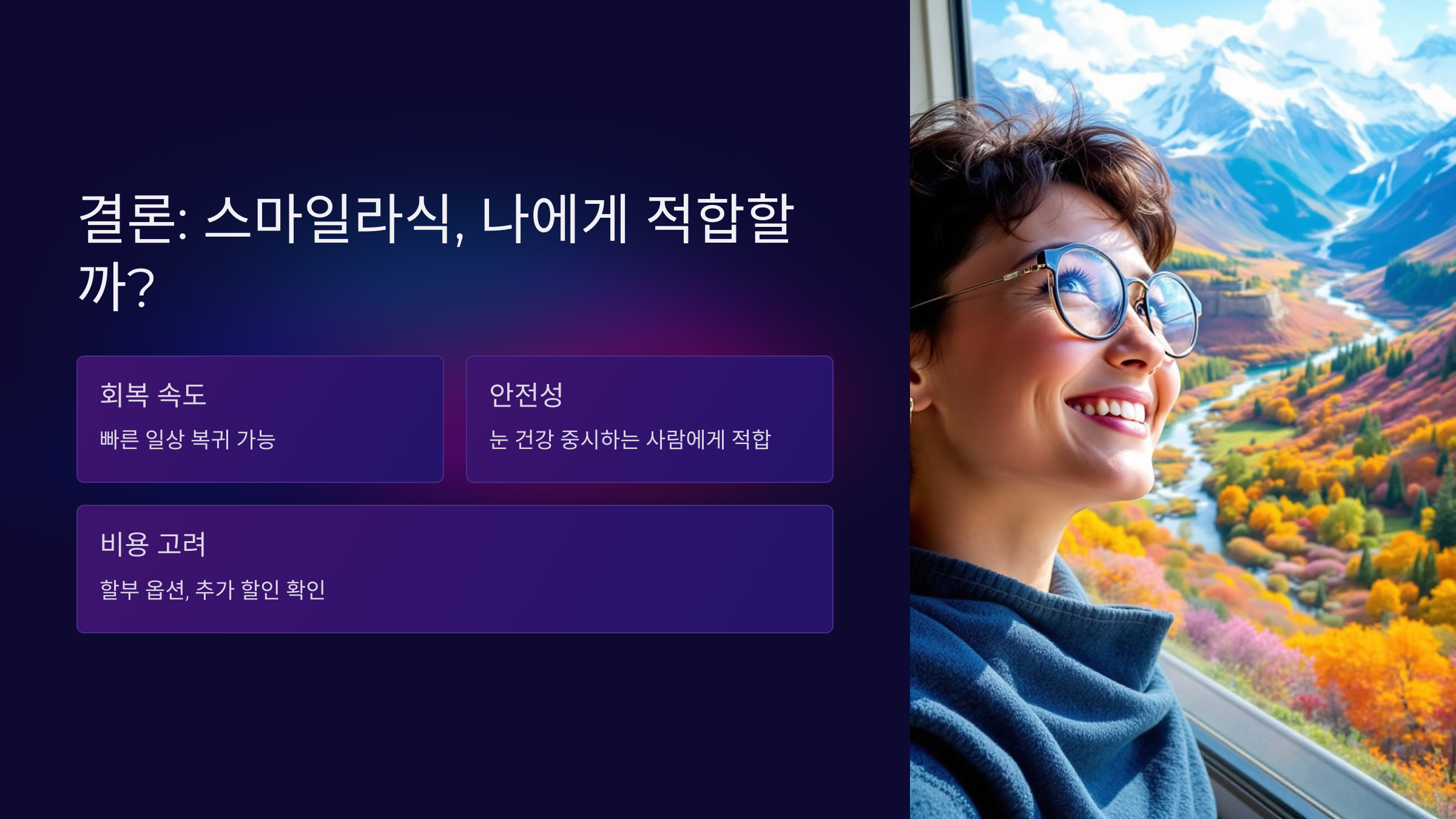 스마일라식은 비용이 다소 높게 느껴질 수 있지만, 회복 속도와 안전성 측면에서 큰 장점을 가지고 있어요.