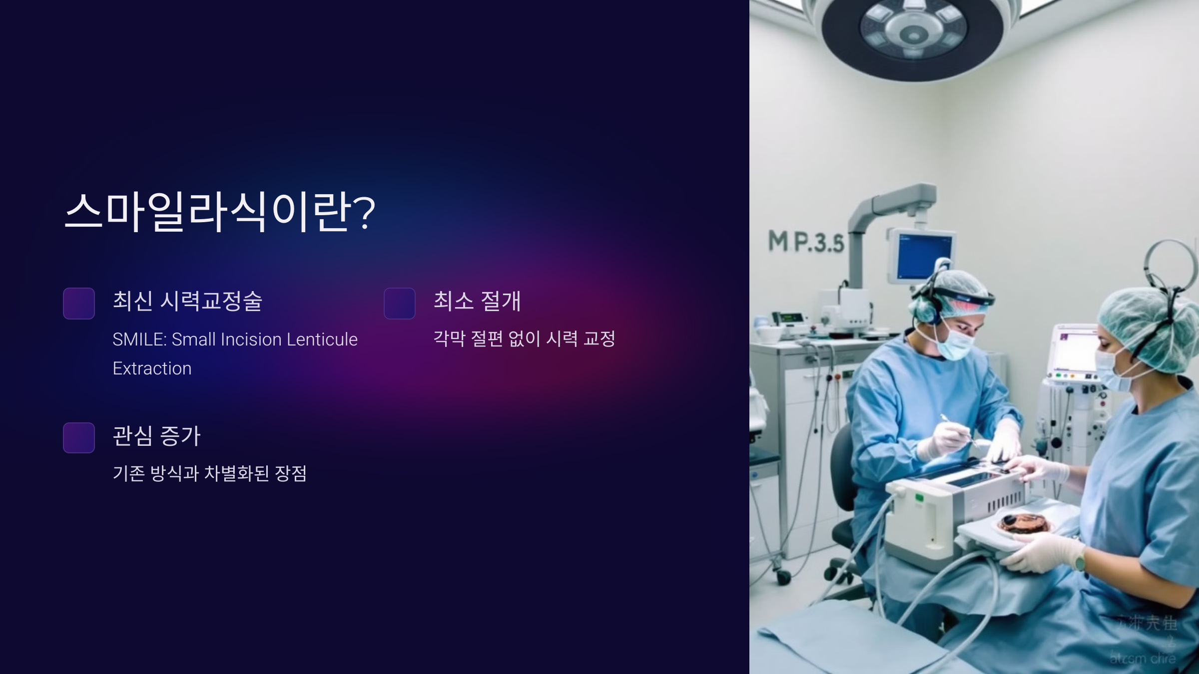 👉 단점: 각막 절편 때문에 외부 충격에 약할 수 있음. - 스마일라식: 최소 절개(2~4mm)를 통해 각막 안쪽의 렌티큘을 제거해 시력을 교정합니다.