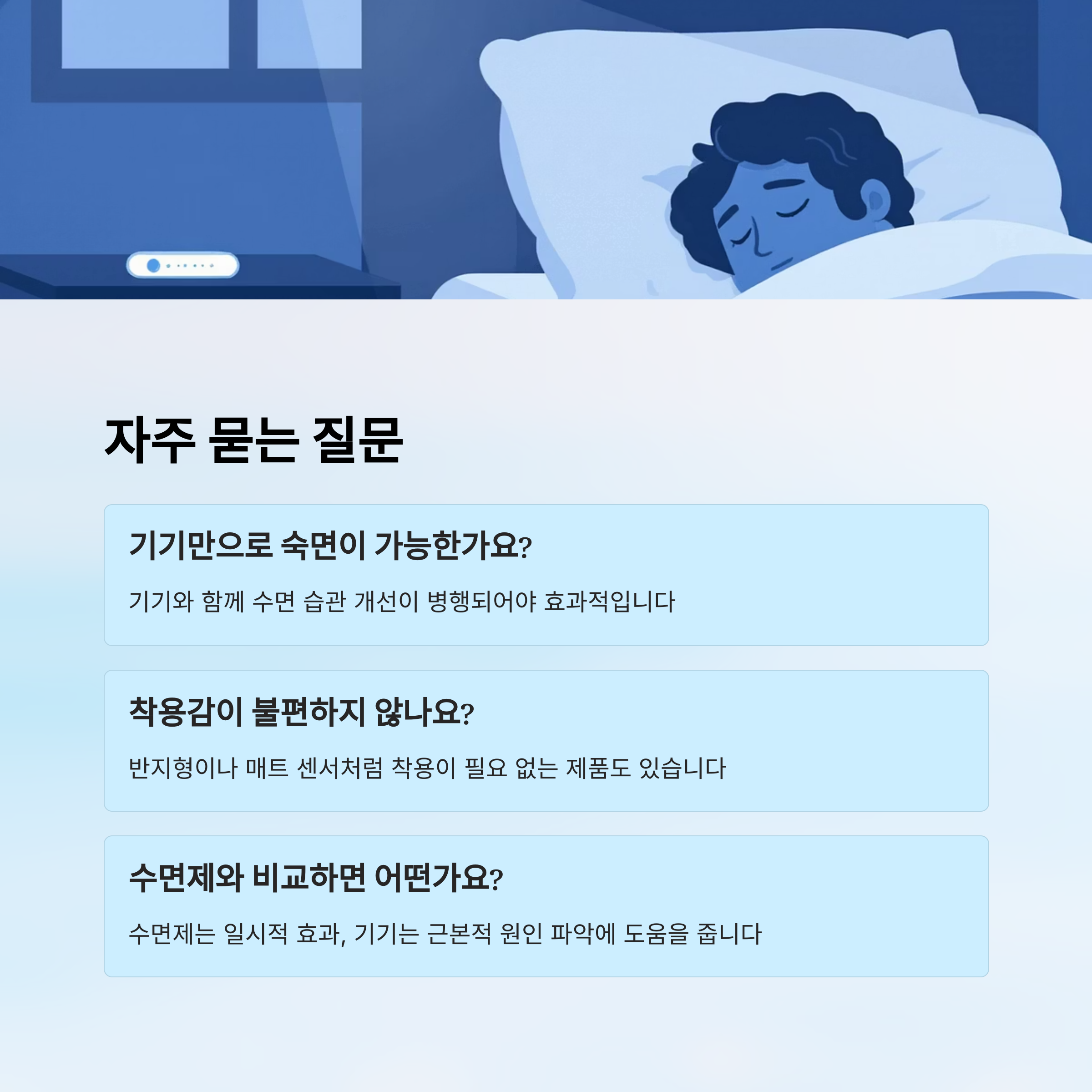A7. 수면제는 단기적이고 일시적 효과에 가깝고, 스마트 기기는 근본적인 원인을 파악하고 개선하는 데 도움을 줘요.