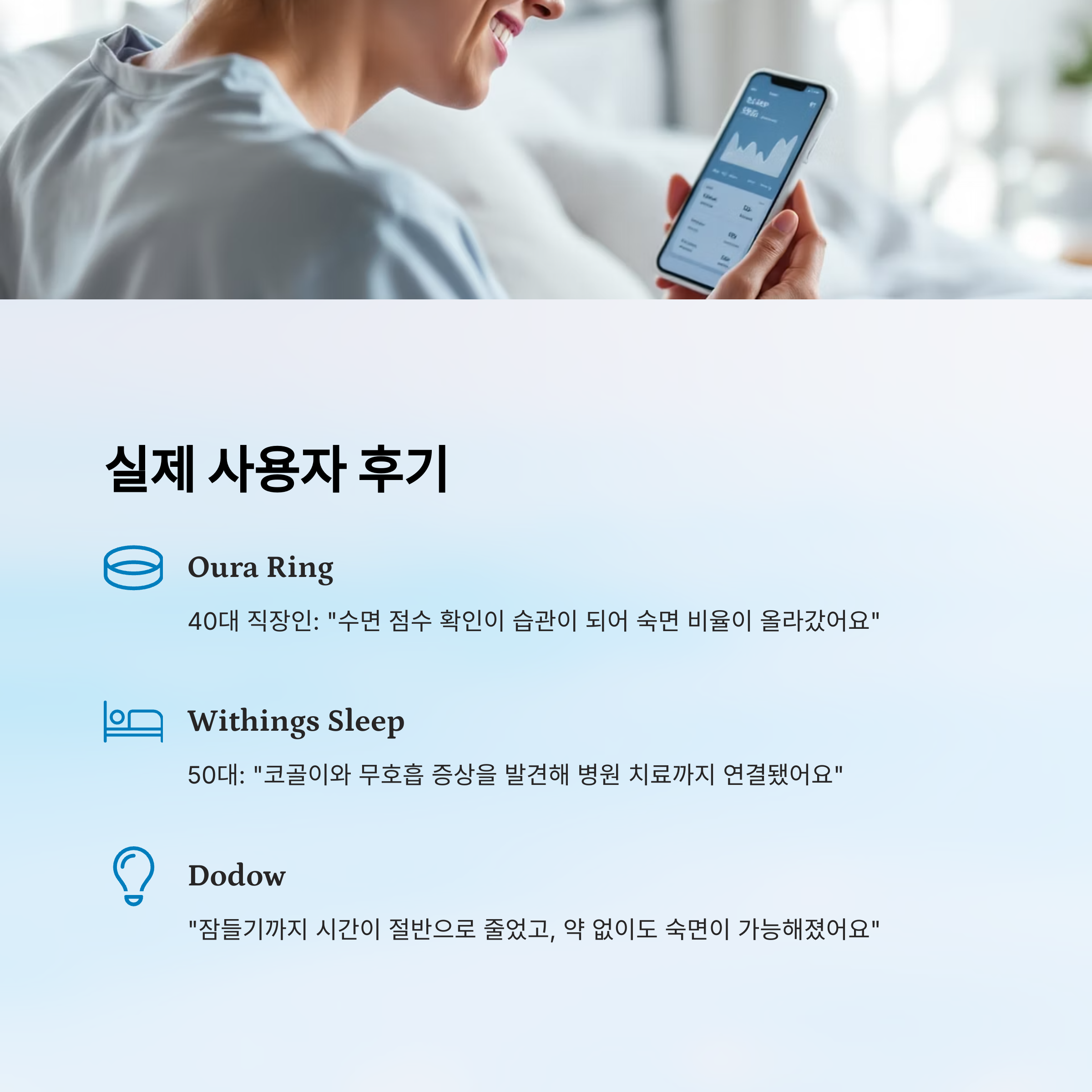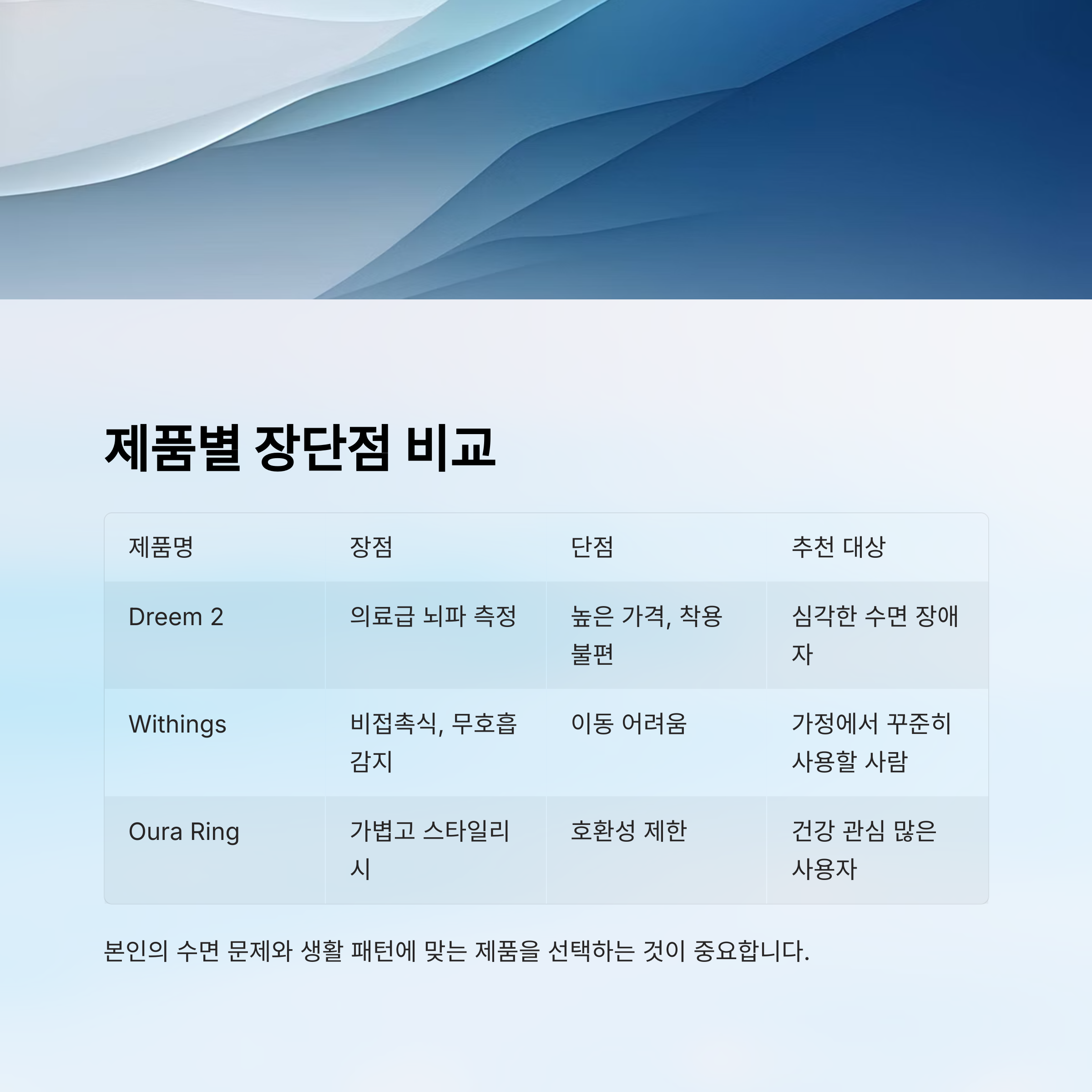 어떤 기기를 선택할지 고민된다면, 본인의 수면 문제와 생활 패턴을 먼저 생각해보는 게 좋아요. 데이터 분석이 필요한지, 단순한 수면 유도만 원하는지에 따라 완전히 달라지니까요. 정리하자면 뇌파 중심이면 Dreem, 실용성과 편의성을 중시하면 Withings나 Oura, 저렴하고 심플하게 시작하고 싶다면 Dodow가 좋답니다!