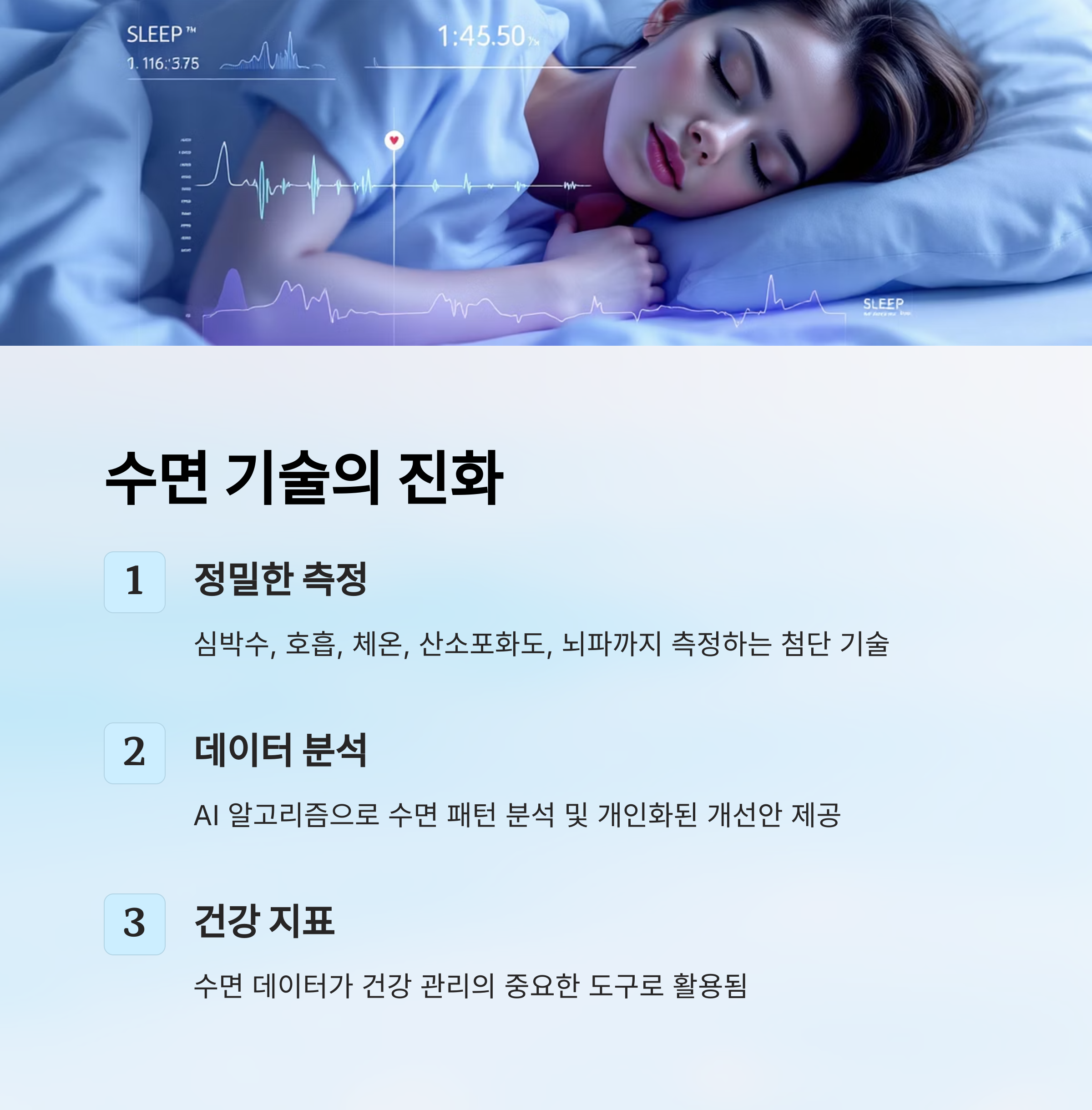 스마트 수면 기기가 본격적으로 주목받기 시작한 건 약 10년 전부터예요. 웨어러블 기술이 발전하면서 손목에 차는 스마트워치나 밴드가 수면을 측정하고 분석할 수 있게 됐고, 그 데이터를 기반으로 더 나은 수면 습관을 유도하기 시작했죠. 그 외에도 수면 중 뒤척임, 코골이, 호흡 상태 등을 감지하는 센서 매트나 스마트 침대도 점점 보편화되고 있어요.