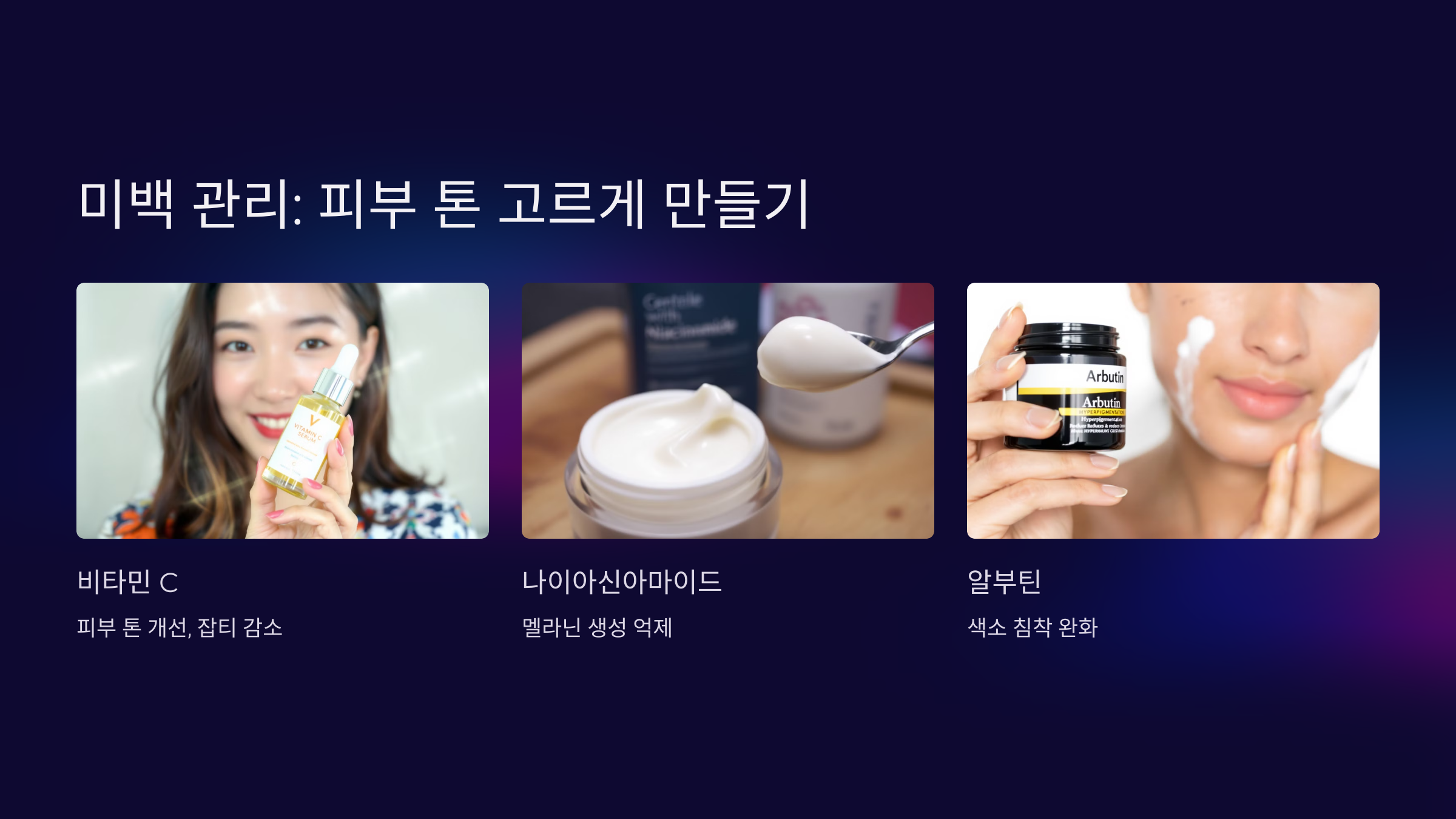 미백 제품에는 비타민 C, 나이아신아마이드, 알부틴 같은 성분이 포함되어야 합니다.