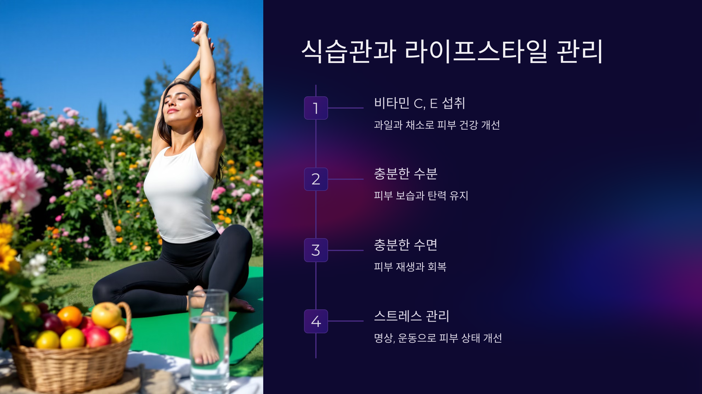 스킨케어는 외부 관리뿐만 아니라 건강한 식습관과 라이프스타일과도 밀접하게 관련이 있습니다.