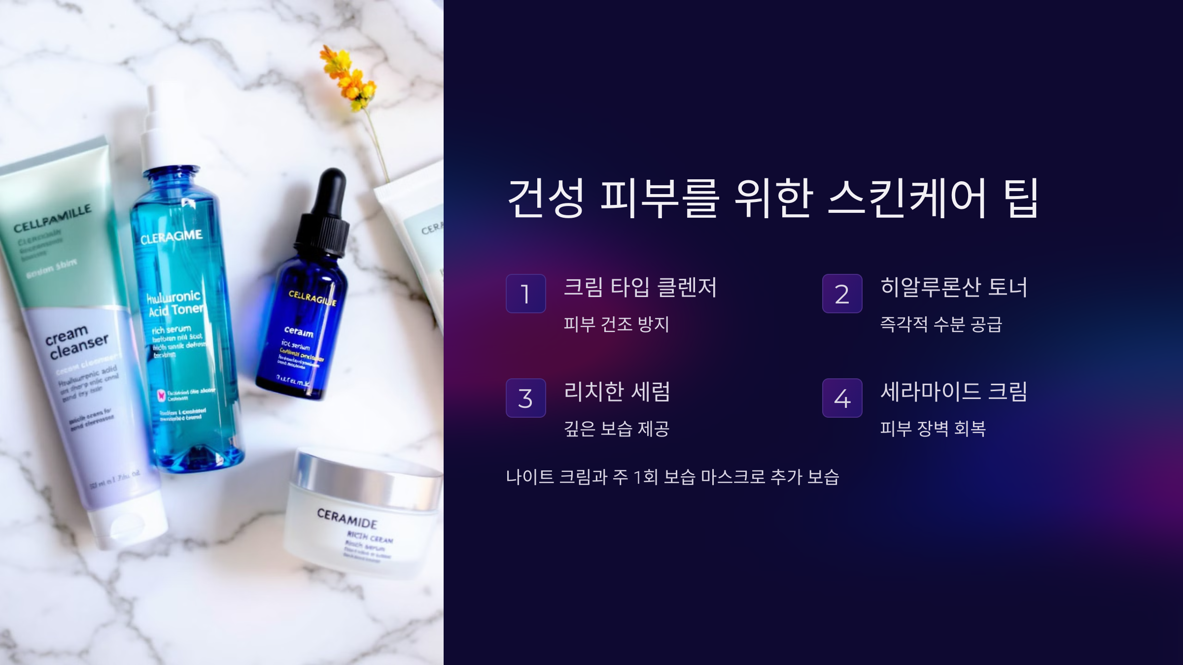 건성 피부는 수분 유지와 보습이 중요합니다. 피부 장벽을 강화하는 제품을 선택하세요.
