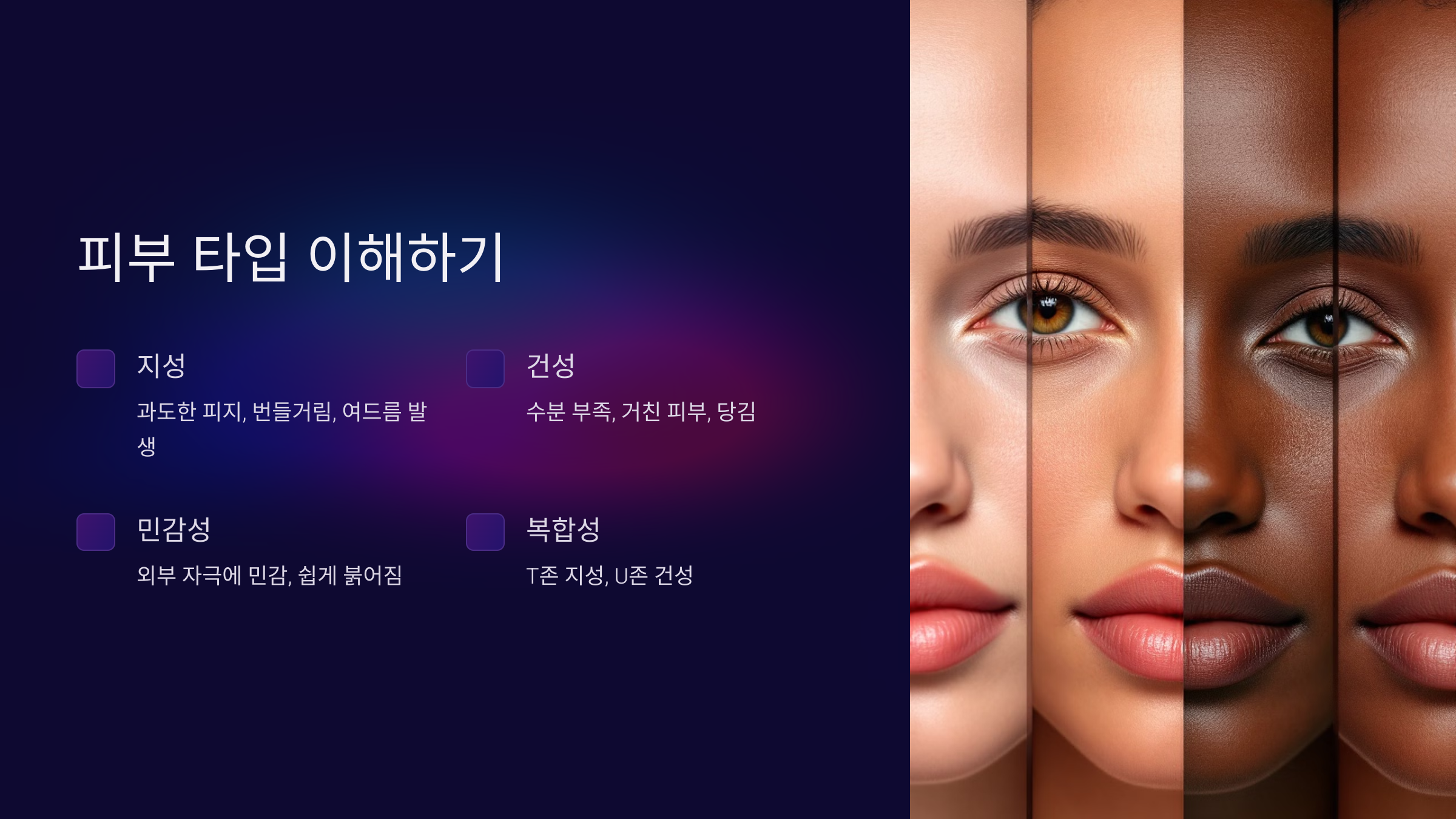 피부 타입은 크게 지성, 건성, 민감성, 복합성으로 나뉩니다. 각 타입에 따라 적합한 스킨케어 방법이 달라집니다.