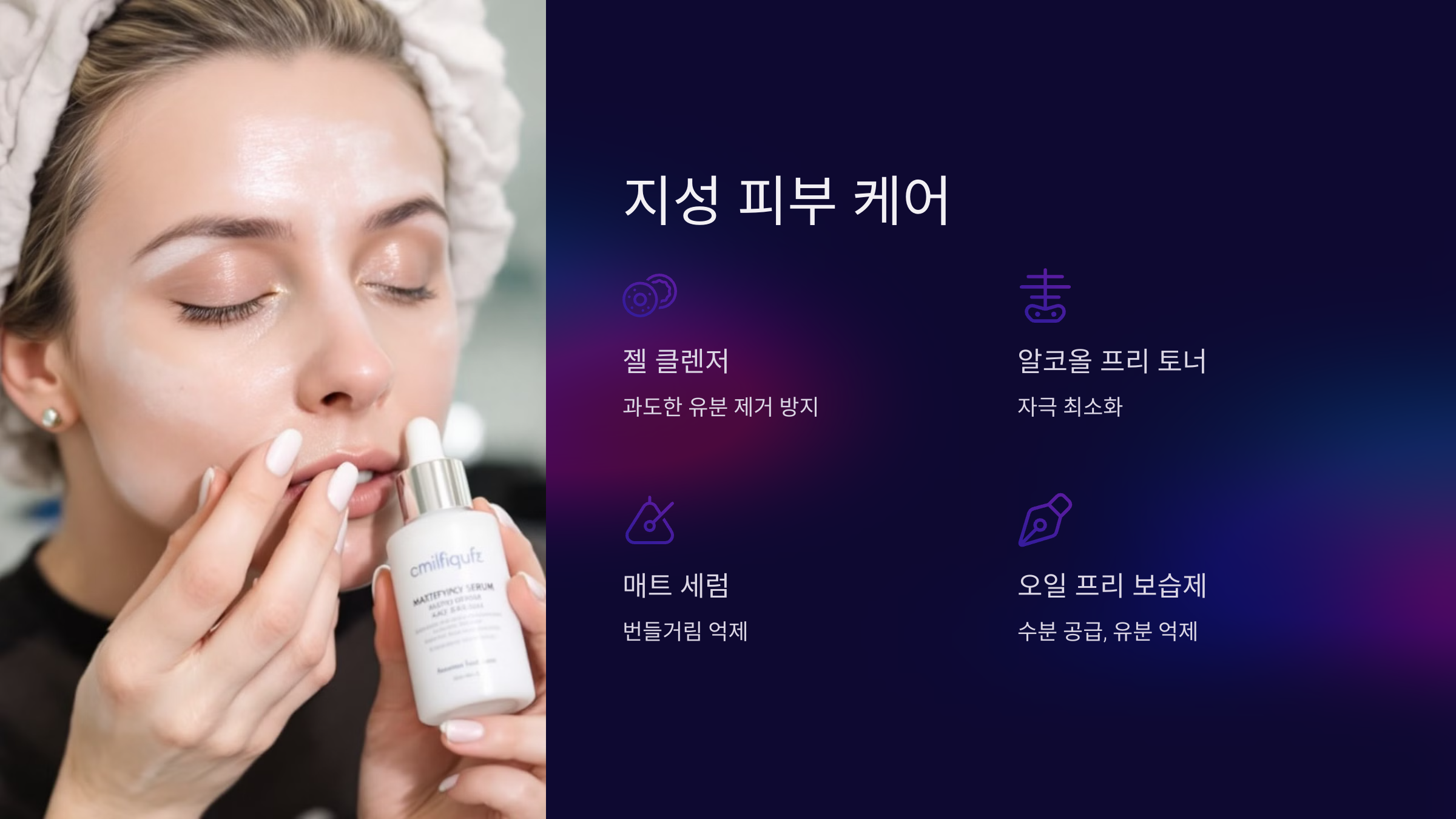 지성 피부는 피지 조절이 핵심입니다. 이를 위해 유분을 제거하면서도 과도하게 건조하지 않게 하는 제품을 선택하세요.
