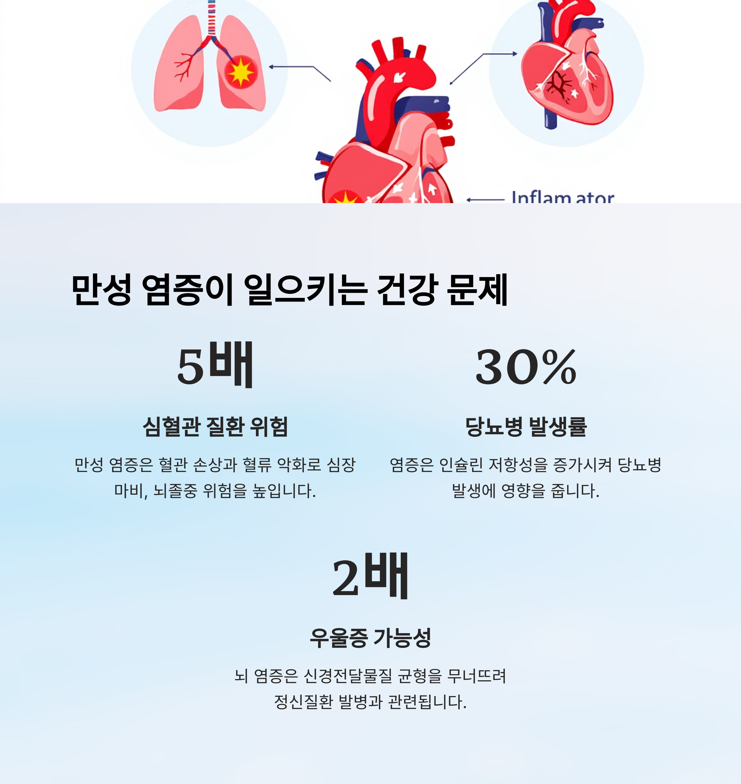 만성 염증은 혈관을 손상시키고 혈류를 악화시켜 심장마비, 뇌졸중 같은 질환의 위험을 높여요. 또 췌장 기능을 저하시켜 인슐린 저항성을 증가시키고 당뇨병 발생률을 높이는 데도 영향을 줘요.