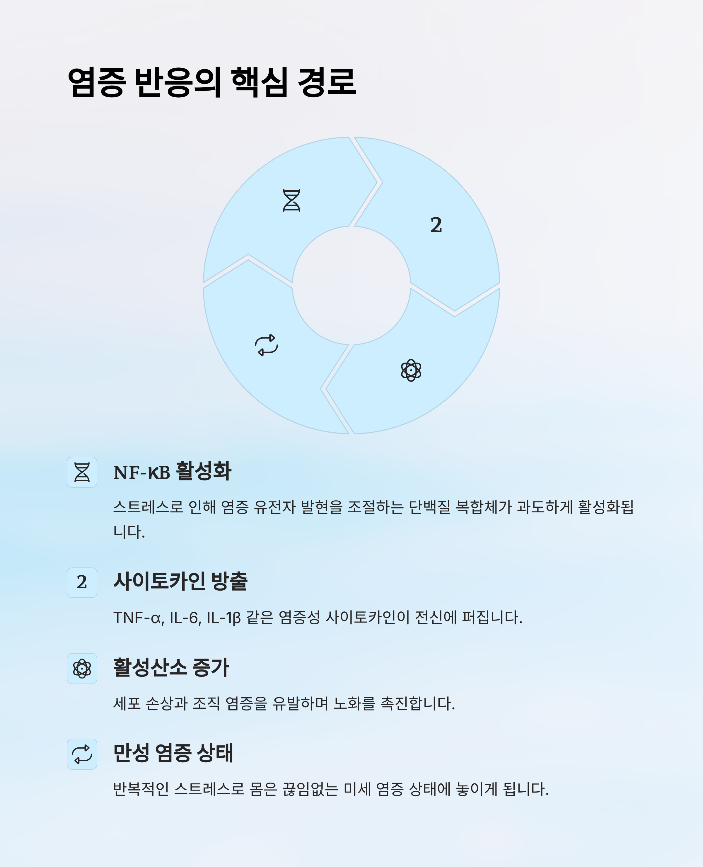 스트레스를 받으면 코르티솔이 급격히 증가하면서, 이 NF-κB가 과도하게 활성화돼요. 그러면 TNF-α, IL-6, IL-1β 같은 염증성 사이토카인이 방출되면서 전신에 염증이 퍼지기 시작하죠.