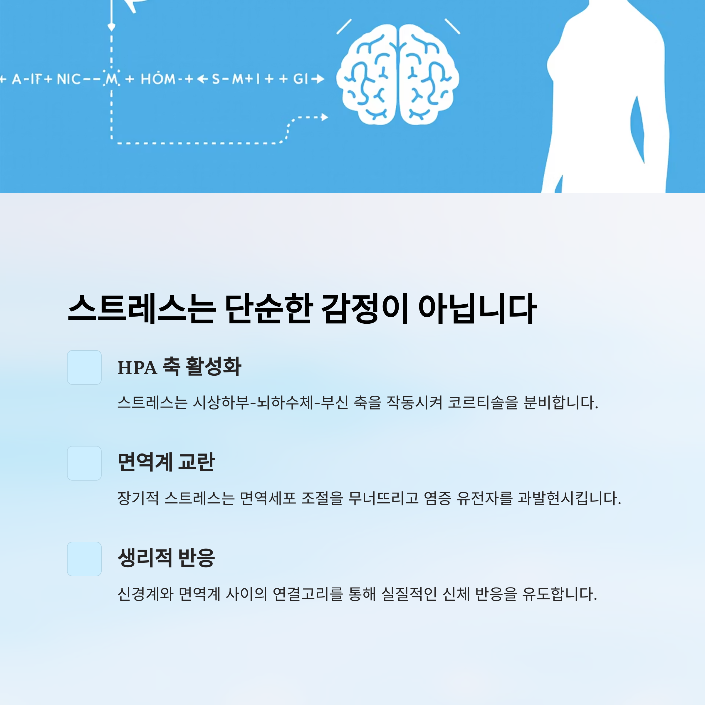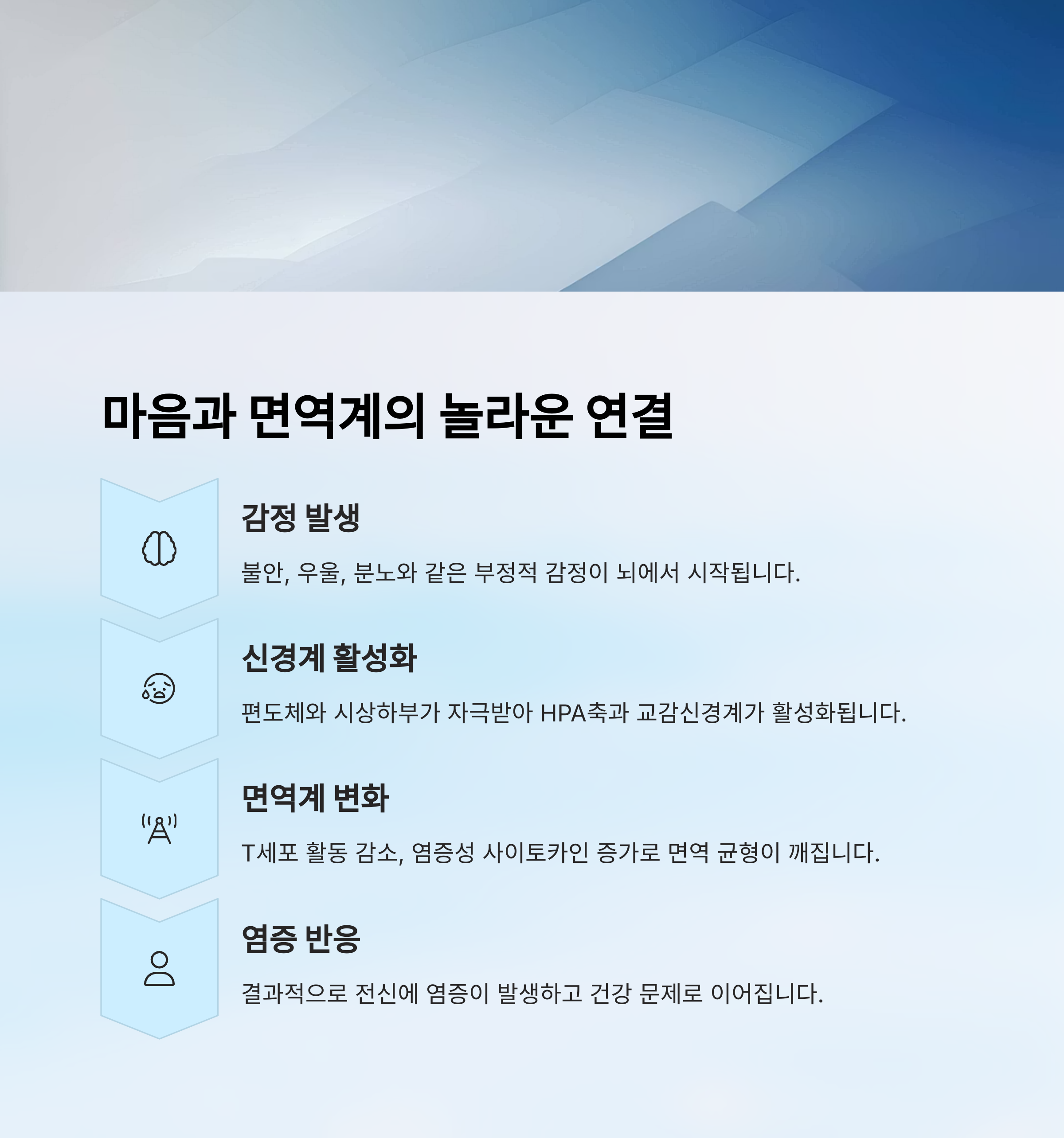 결국 스트레스는 단순한 감정 상태를 넘어서, 신경계와 면역계 사이의 연결 고리를 통해 실질적인 신체 반응을 유도하게 되는 거예요.
