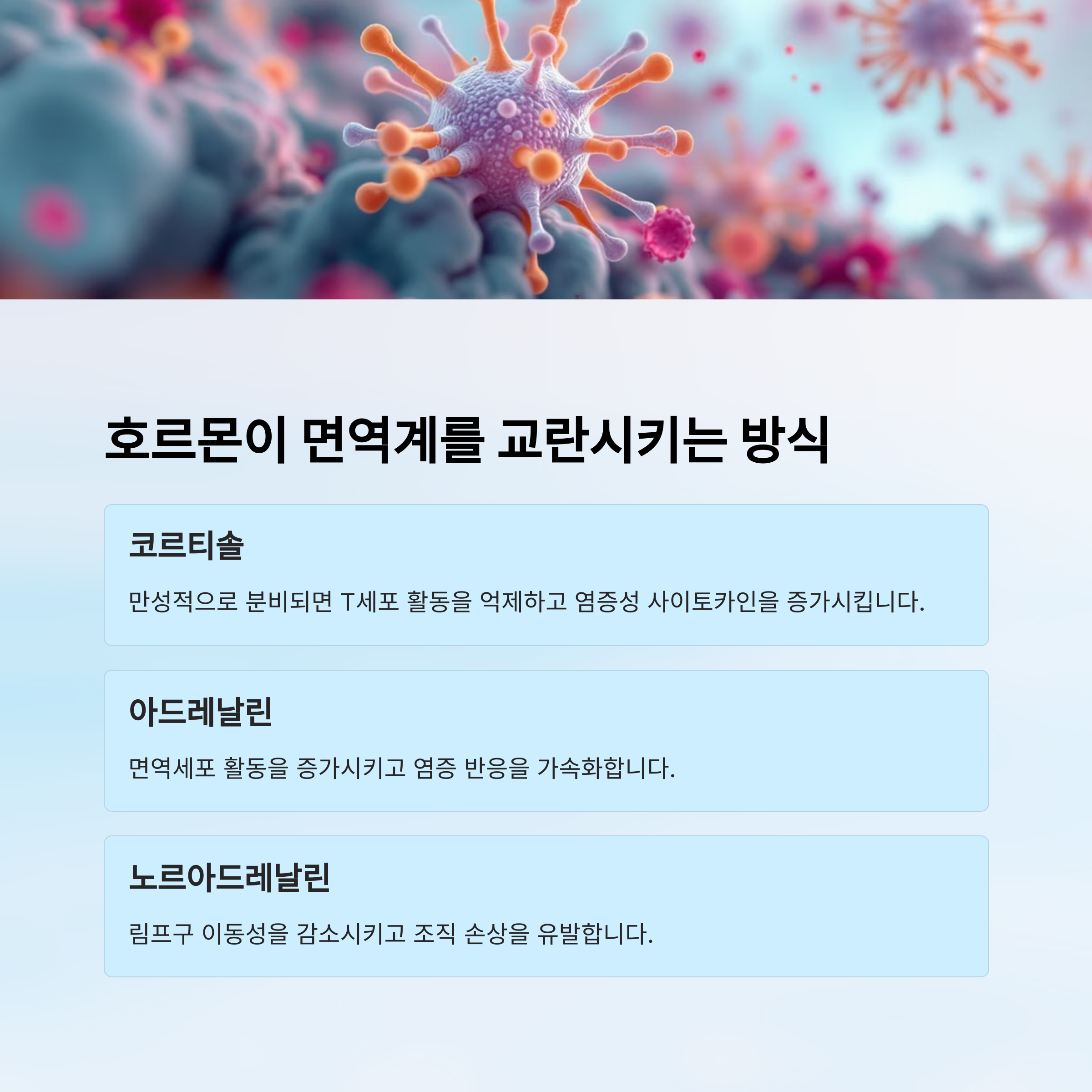 | 아드레날린 | 면역세포 활동 증가 | 염증 반응 가속 |
