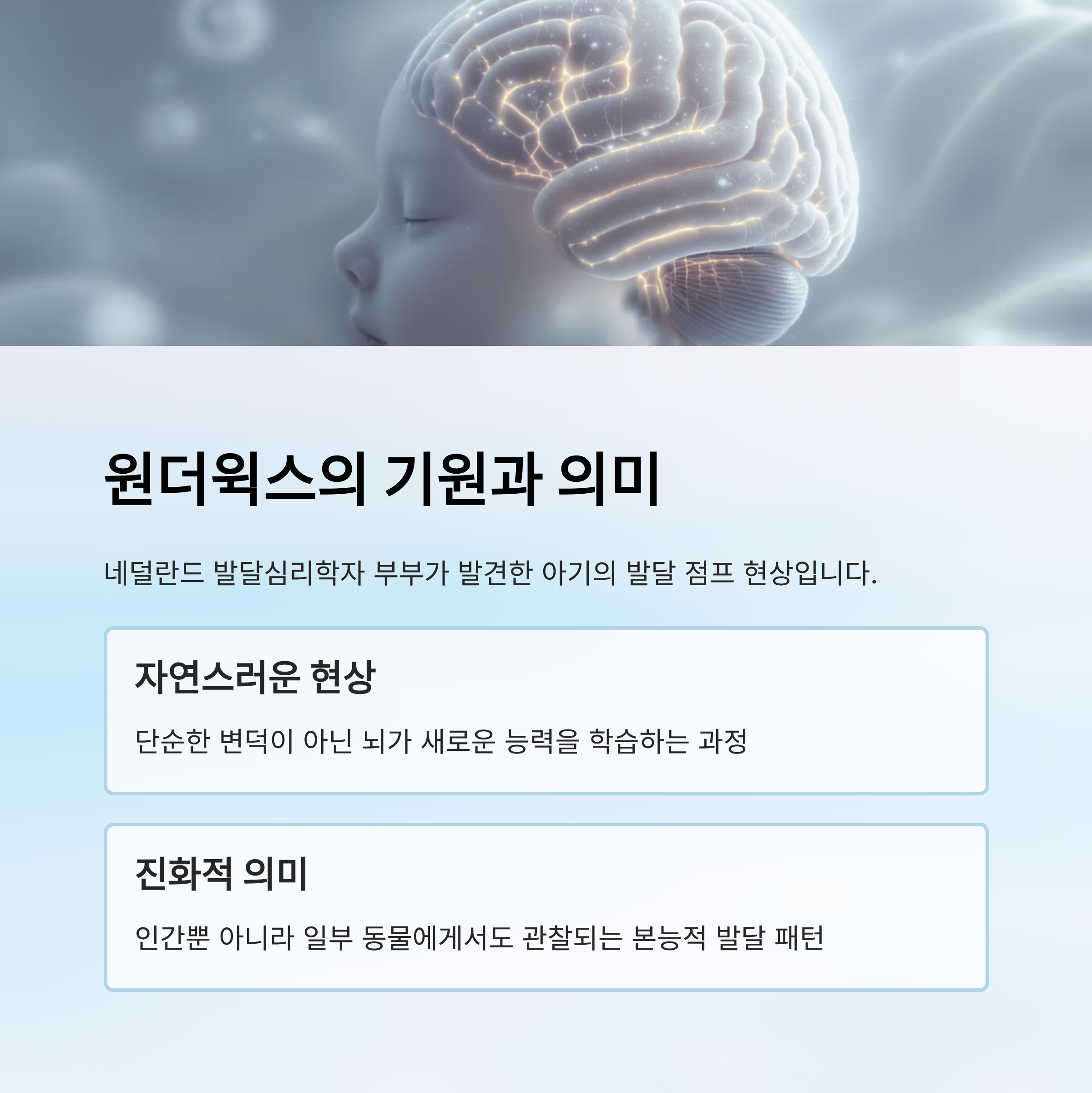 | 프란스 플루이 & 헤티 반더라이트 | 1992년 | 원더윅스 이론 최초 정립 | 아기 발달 점프 주기 설명 |