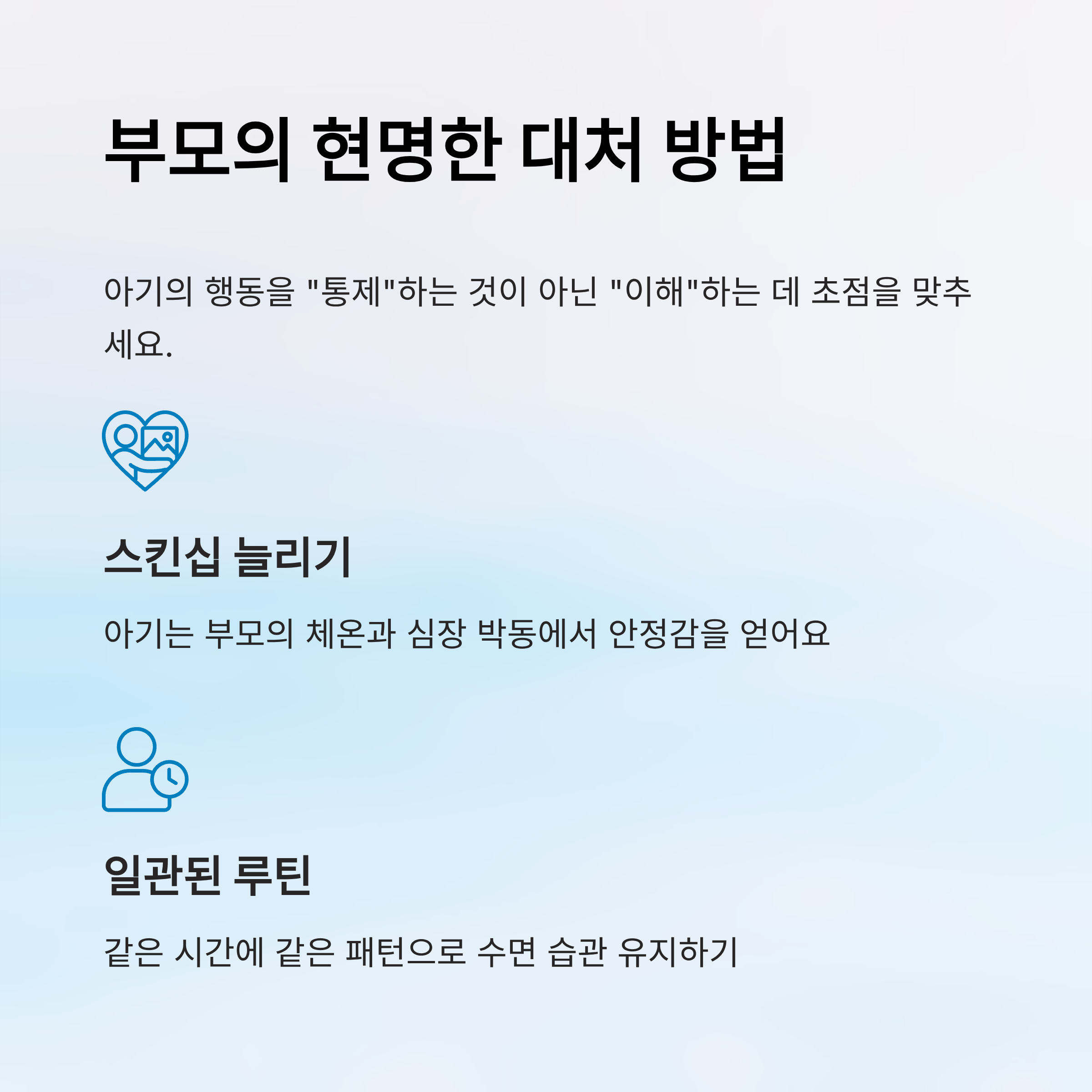 | 짜증과 울음 | 안기 원함 | 안정적인 스킨십 | 부모도 휴식 챙기기 |