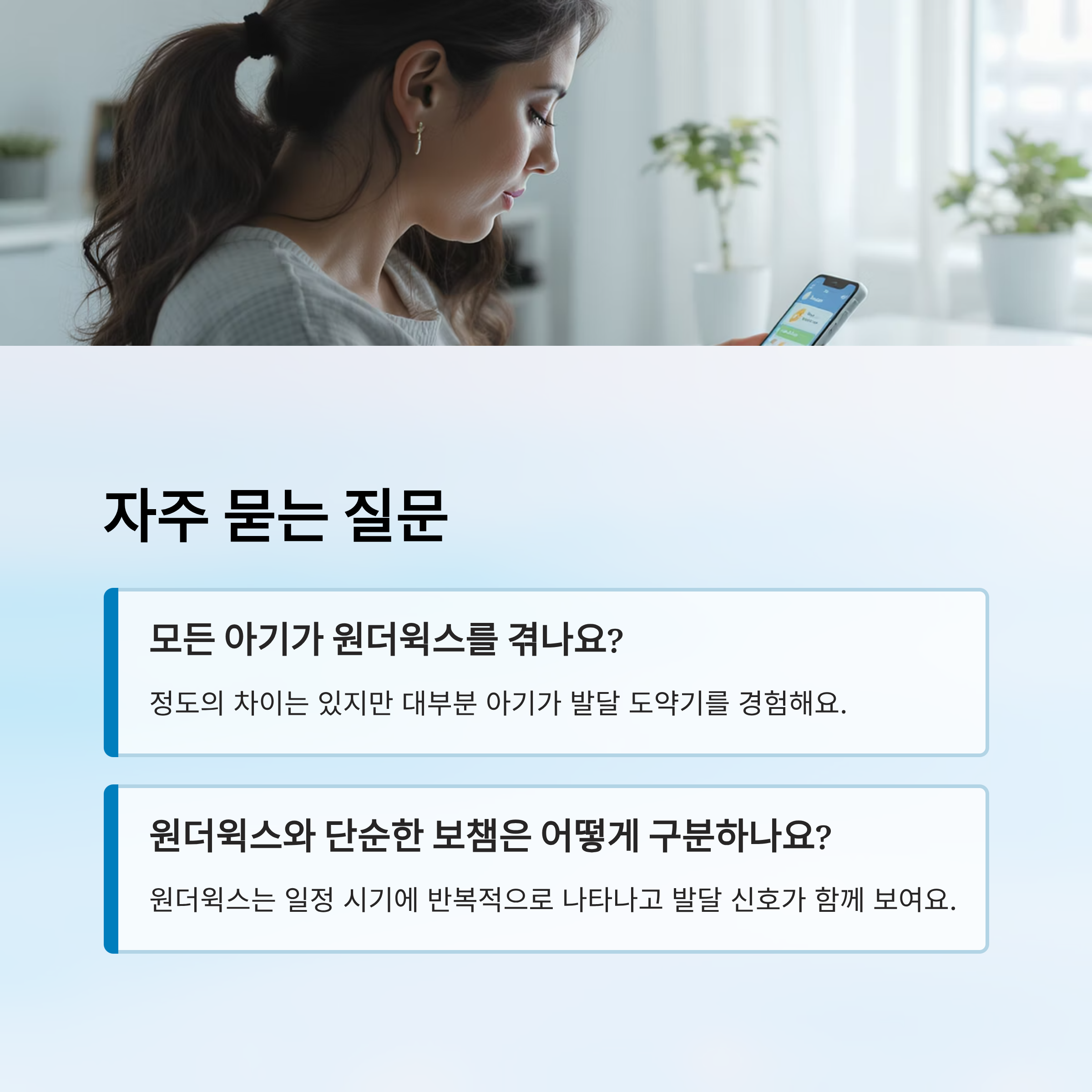 A3. 보통 원더윅스는 일정 시기에 반복적으로 나타나고, 수면 퇴행, 분리불안, 집중력 변화 같은 발달 신호가 함께 보여요. 단순 보챔은 피곤하거나 배고플 때 일시적으로 생겨요.