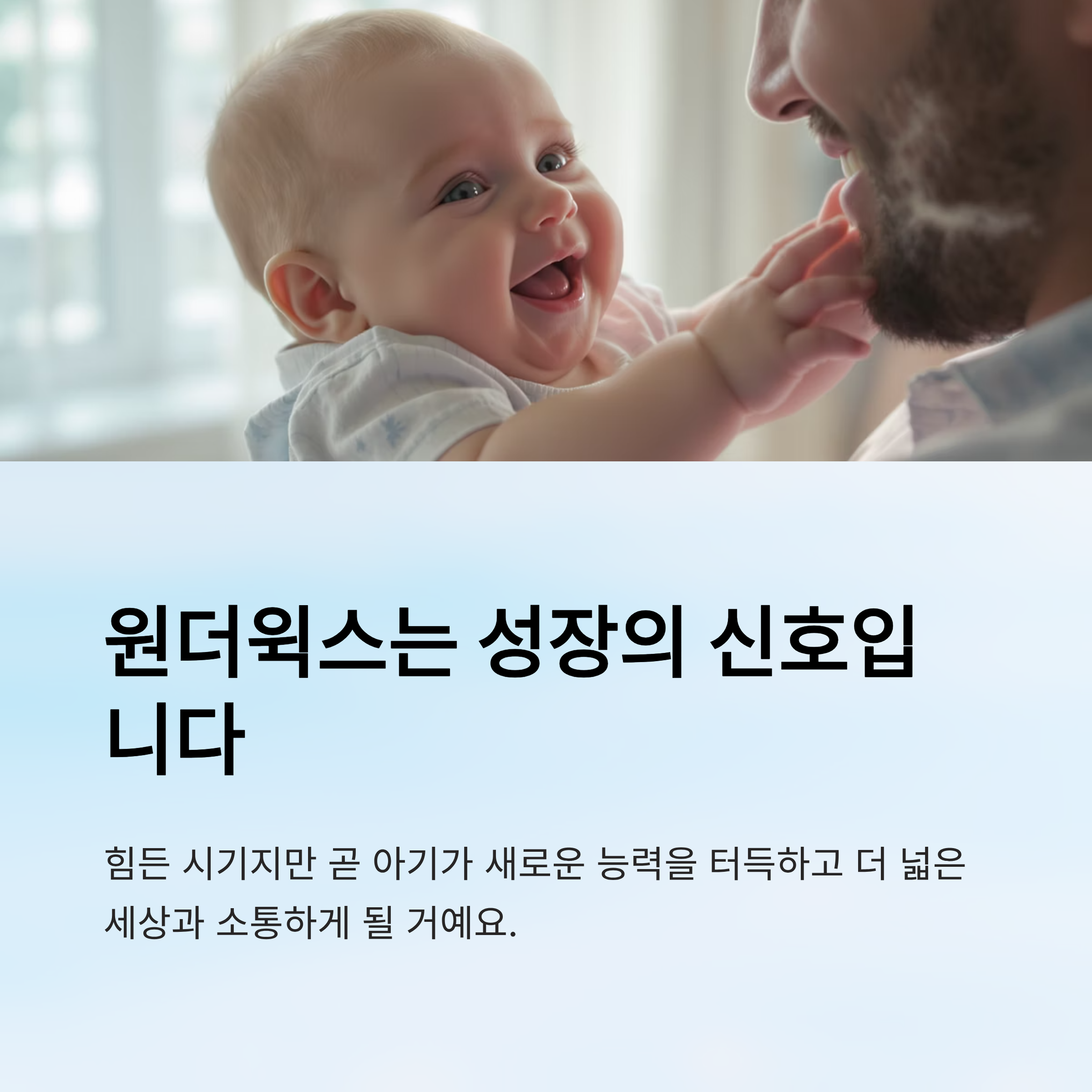 정리하자면, 원더윅스는 단순한 "까다로운 시기"가 아니라 아기가 다음 단계로 성장하기 위한 징검다리예요. 부모가 시기별 특징을 이해하면 아기의 행동이 힘들게만 보이는 것이 아니라 “발달 신호”로 보이게 되고, 훨씬 더 여유 있게 받아들일 수 있답니다. 🌈