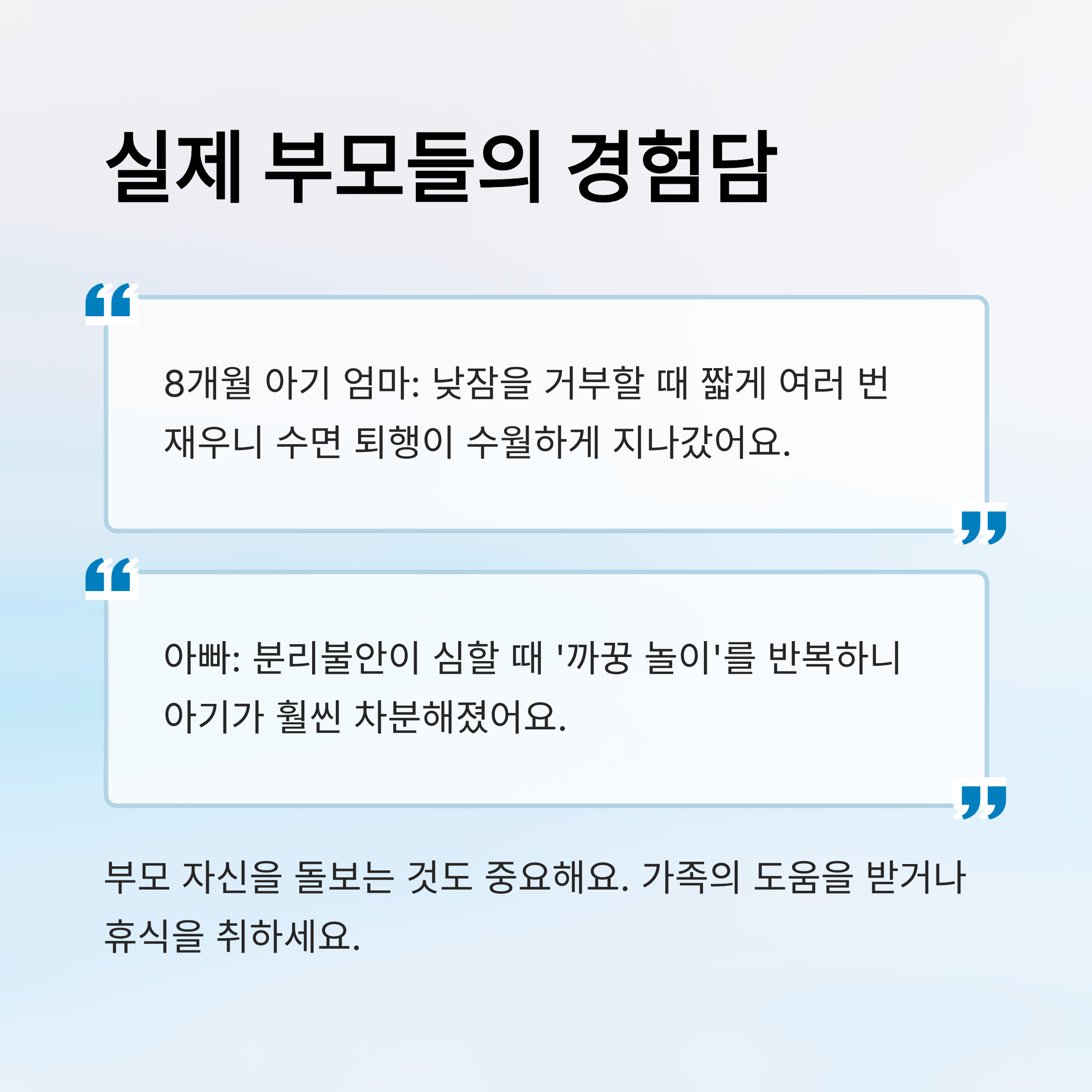 | 짜증과 울음 | 부모 교대로 돌봄 | 부모 피로 완화 | 맞벌이 가정 적용 |