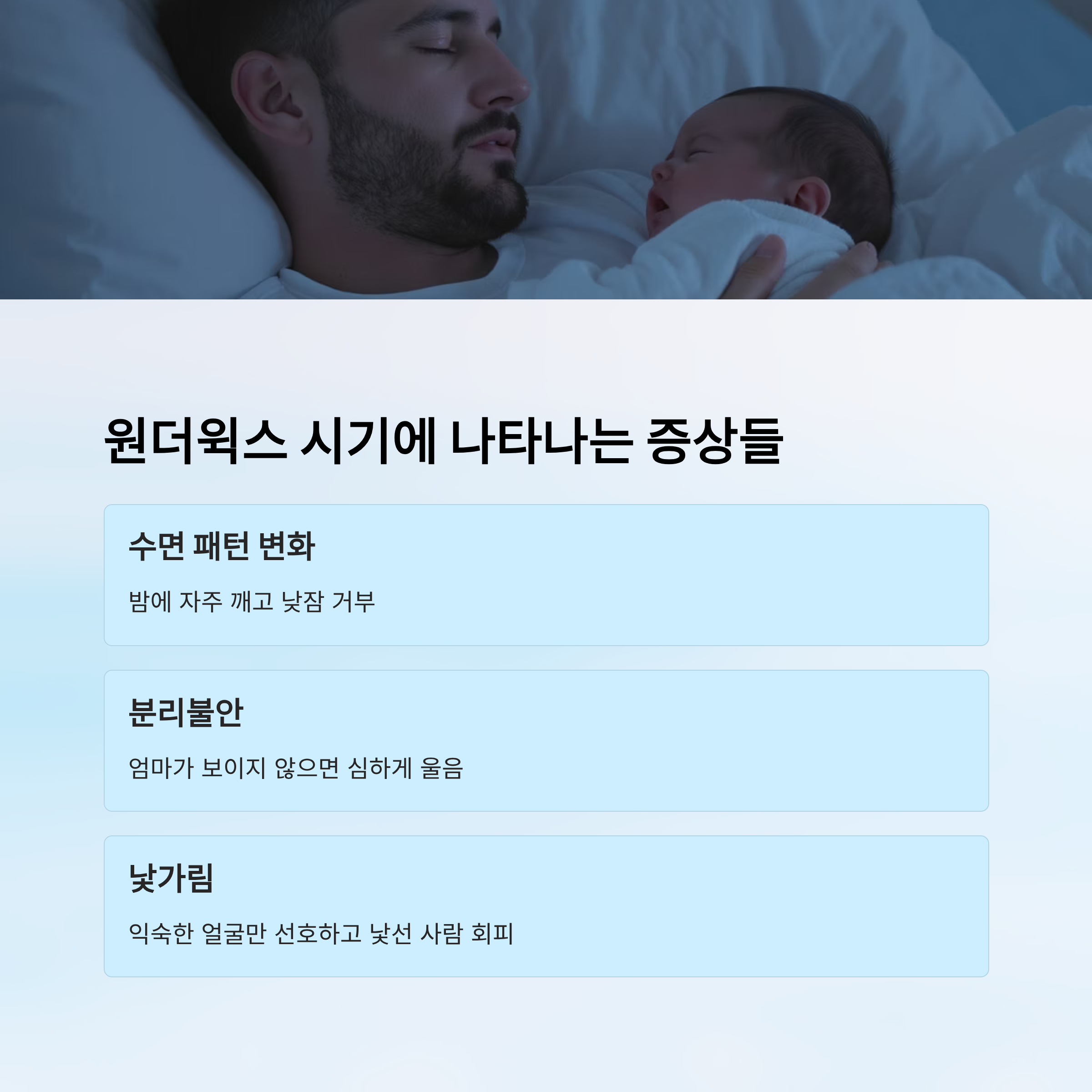 특히 아기가 칭얼거림이 심해지고 낯가림이 시작되는 시기가 대표적인 원더윅스 증상 중 하나예요. 부모 입장에서는 "갑자기 왜 이럴까?"라는 의문이 들지만, 사실 이는 아기가 새로운 세상을 받아들이는 과정에서 느끼는 불안의 표현이에요. 그렇기 때문에 아기의 변화가 단순한 투정으로 보이지 않도록 이해하는 것이 중요해요.