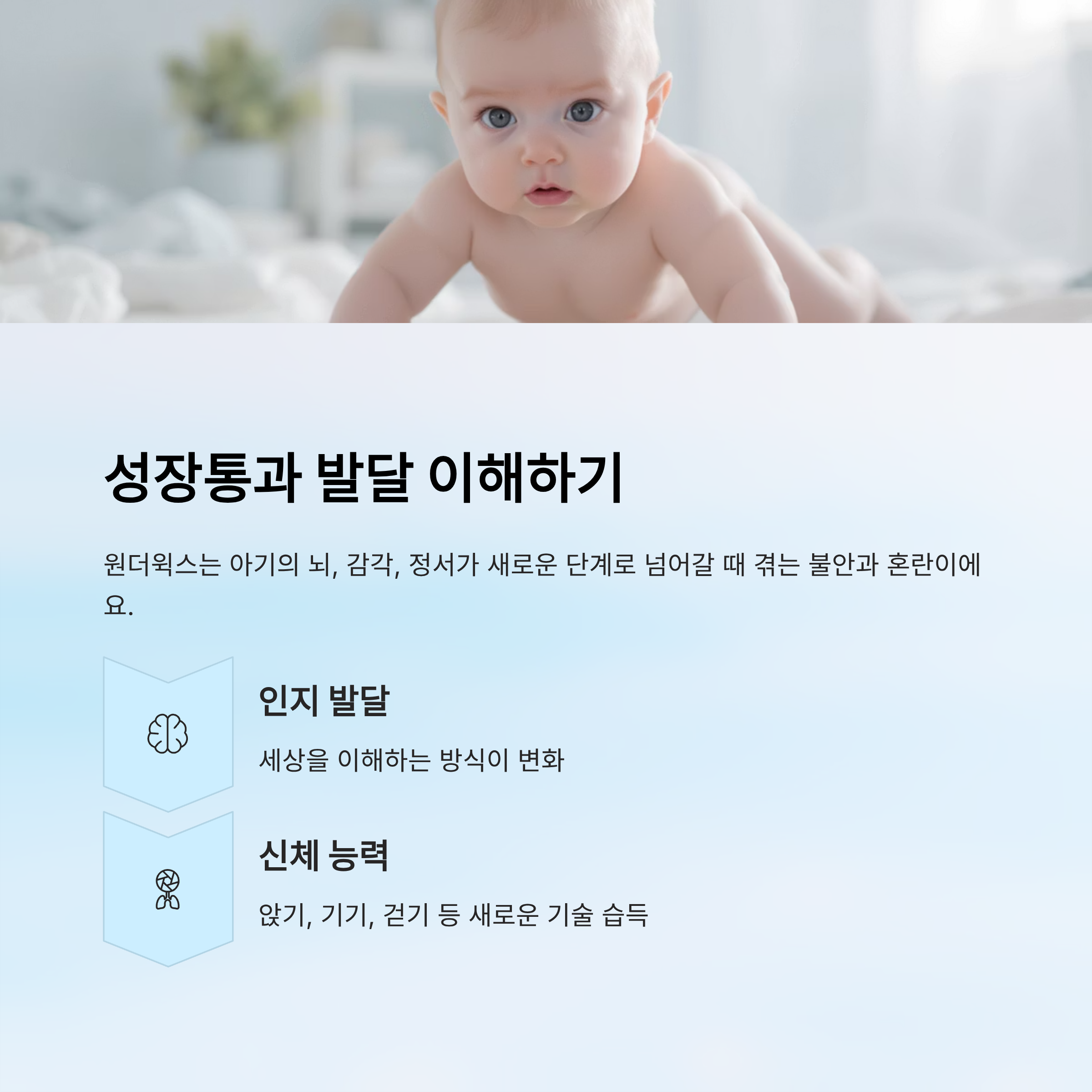 원더윅스 시기를 흔히 "성장통"이라고 부르기도 해요. 이 말은 단순히 신체적인 통증을 의미하는 게 아니라, 아기의 뇌와 감각, 정서가 새로운 단계로 넘어갈 때 겪는 불안과 혼란을 뜻해요. 아기는 세상을 바라보는 시각이 하루가 다르게 달라지기 때문에, 어제는 익숙했던 상황이 오늘은 낯설게 느껴질 수 있답니다.