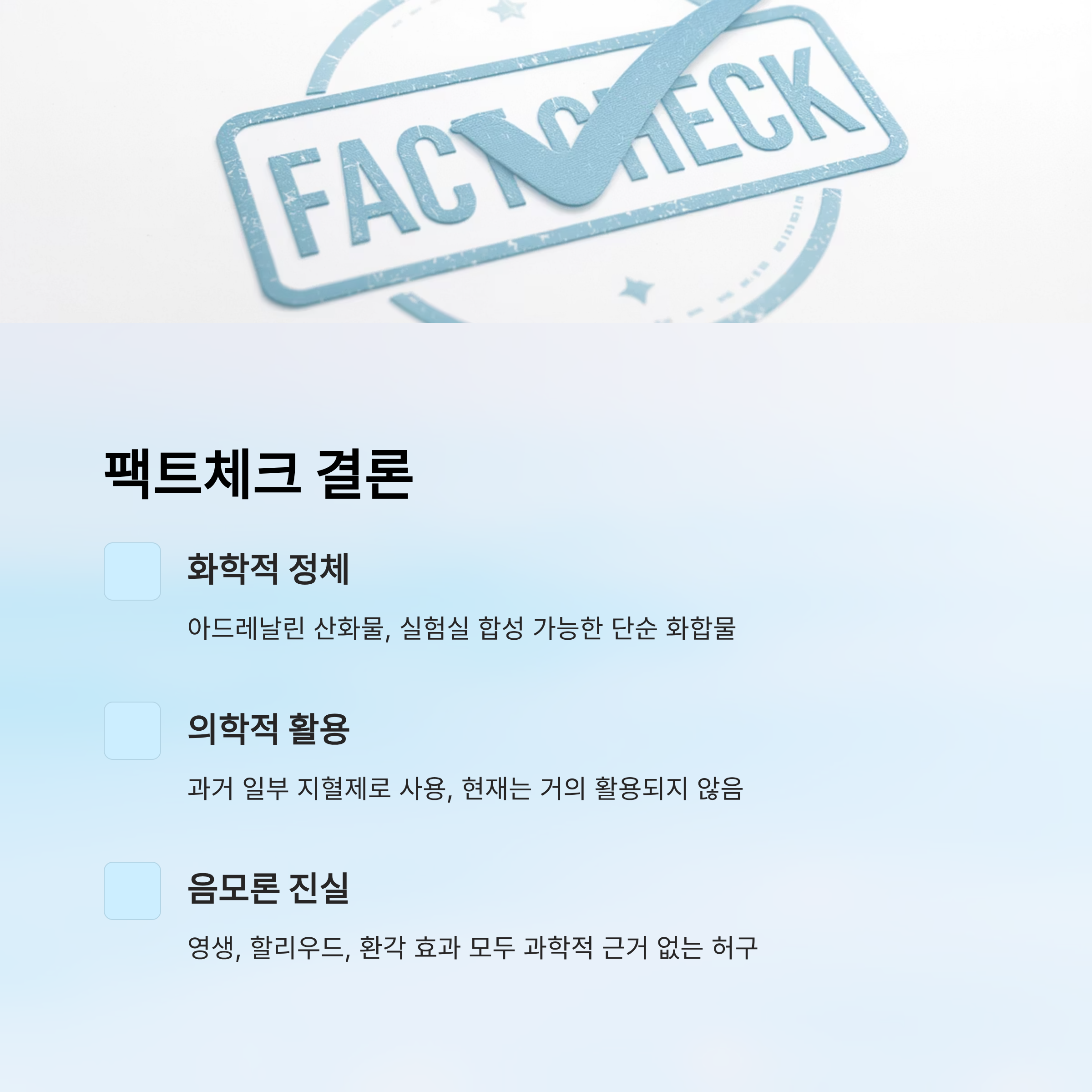 이제 아드레노크롬이 단순히 신비한 물질이 아닌, 명확한 합성 경로와 화학적 성질을 가진 물질이라는 걸 아셨을 거예요. 그럼 지금부터는 사람들 사이에 퍼진 오해들을 하나씩 짚어볼게요! 👀