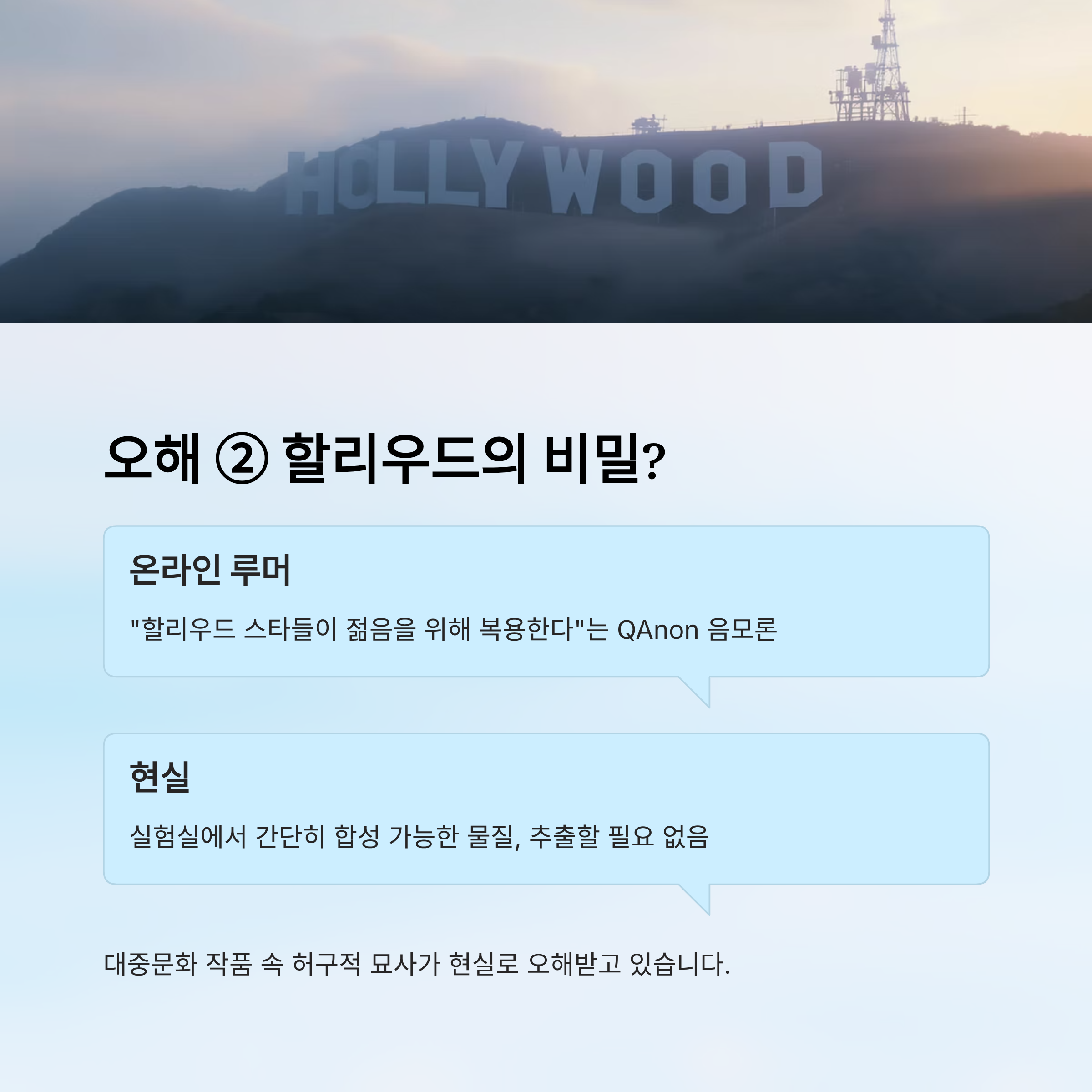 게다가, SNS나 온라인에서 돌고 도는 '할리우드 음모론', '영생을 위한 물질' 등의 주장은 전부 과학적인 근거가 전혀 없는 억측이거나, 대중문화의 허구에서 비롯된 이야기예요. QAnon 같은 음모론 단체에서 의도적으로 만든 허위 정보가 많아요. 🤯