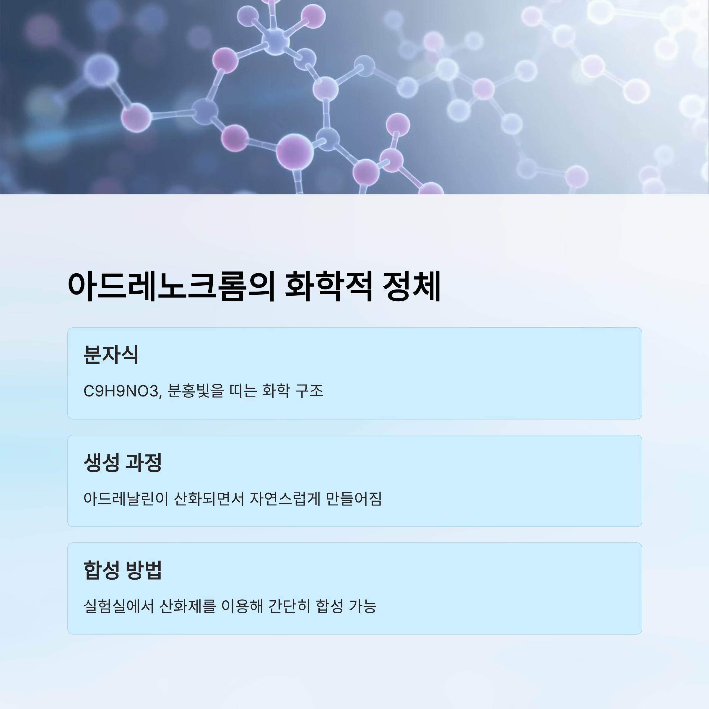 아드레노크롬은 아드레날린(에피네프린)이 산화되면서 만들어지는 물질이에요. 분자식은 C9H9NO3로, 분홍빛을 띠는 특이한 화학 구조를 가지고 있어요. 아드레날린이 체내에서 산화되면 자연스럽게 생성되며, 실험실에서는 산화 은(I)이나 과황산칼륨 같은 산화제를 이용해서 합성할 수 있죠. 🧪
