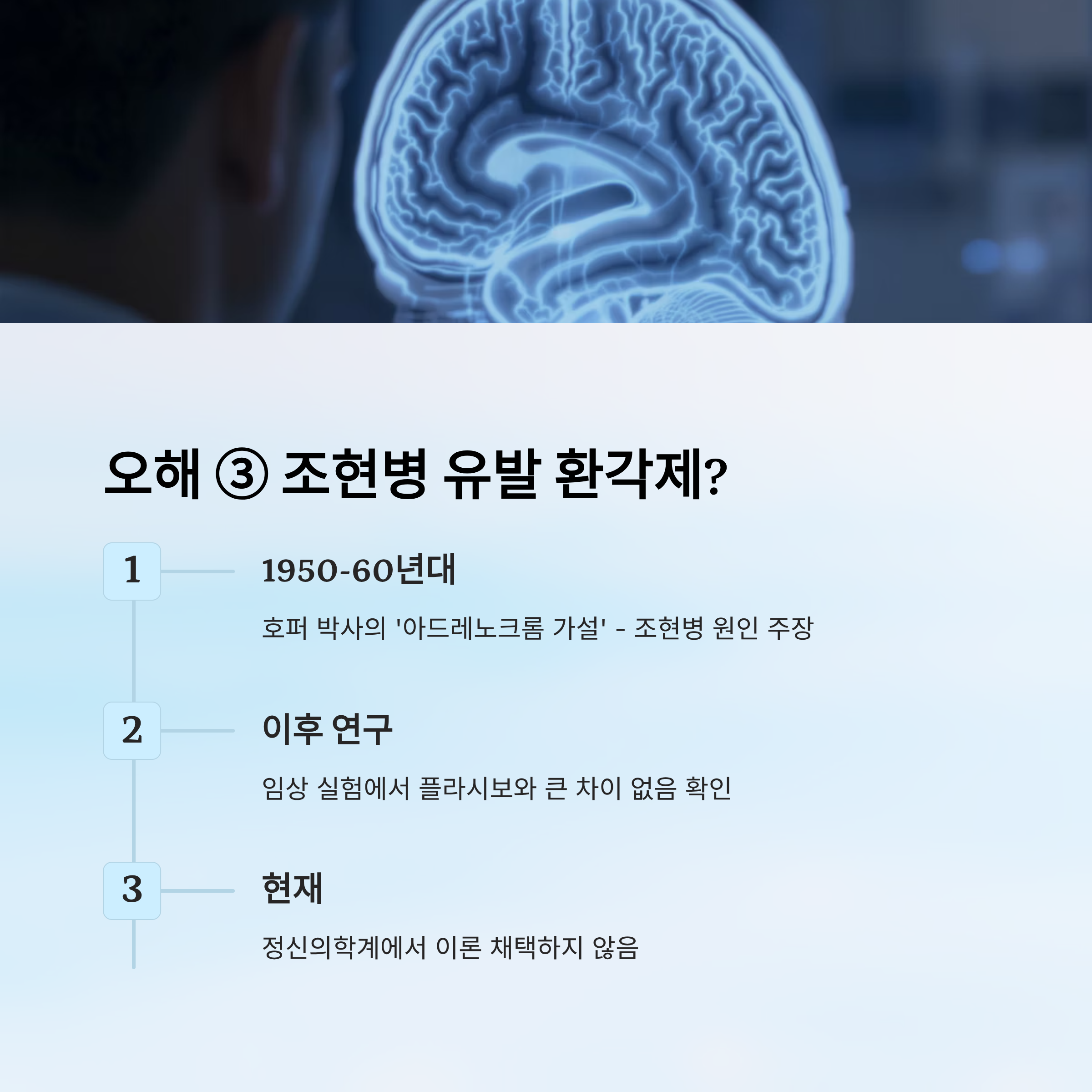 세 번째 오해는 아드레노크롬이 환각작용을 일으켜 조현병(정신분열증)을 유발한다는 주장이에요. 이 이야기는 1950~60년대 캐나다의 정신과 의사였던 아브람 호퍼 박사와 험프리 오스먼 박사가 주장한 '아드레노크롬 가설'에서 비롯됐어요. 🧪