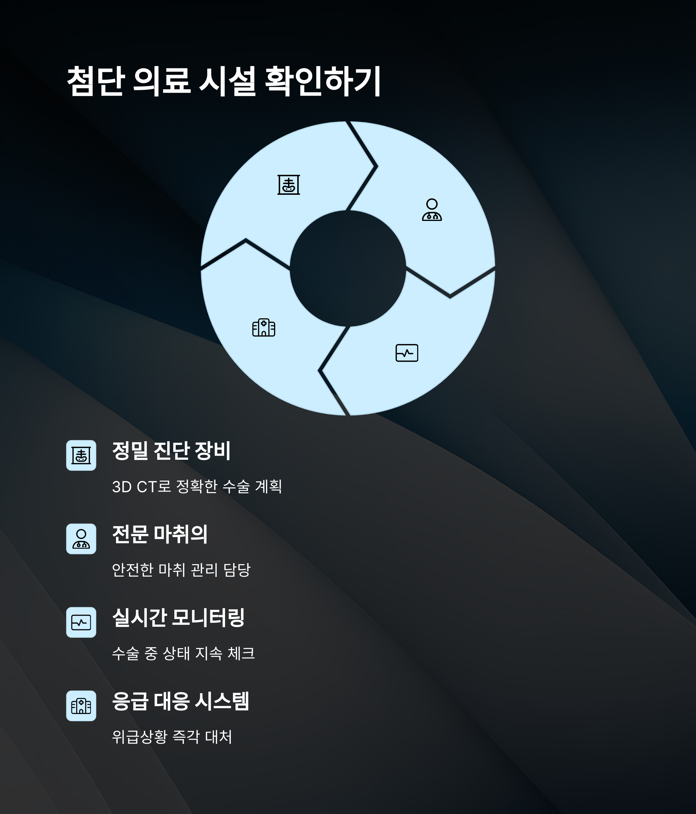 | 전신마취 시스템 | 긴 수술 중 안정적인 마취 유지 | 마취과 전문의 상주 여부 확인 |