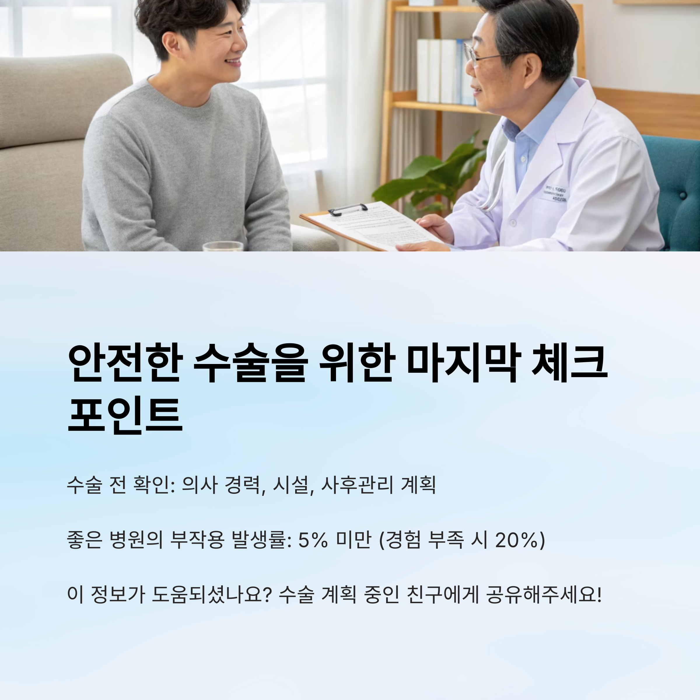부작용을 줄이려면 수술 전 충분한 상담과 정밀 검사를 받는 것이 중요해요. 또한, 안전한 병원을 선택하는 것이 가장 중요한 예방 방법이에요! 😊