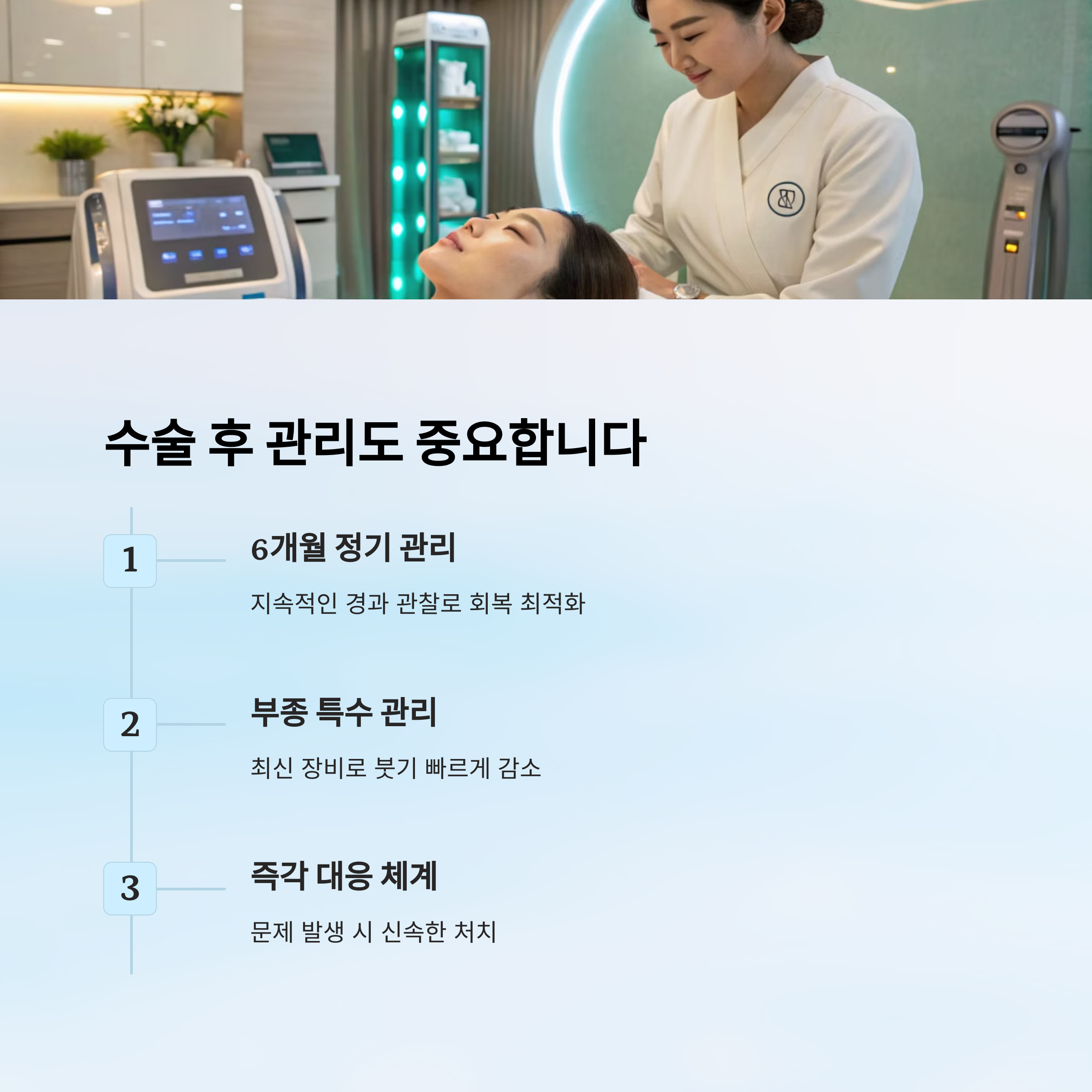 수술 후 관리가 부족하면 회복이 더디거나 부작용이 생길 수 있어요. 병원 선택 시 사후 관리 시스템이 잘 갖춰져 있는지도 꼼꼼히 확인하세요! 😊