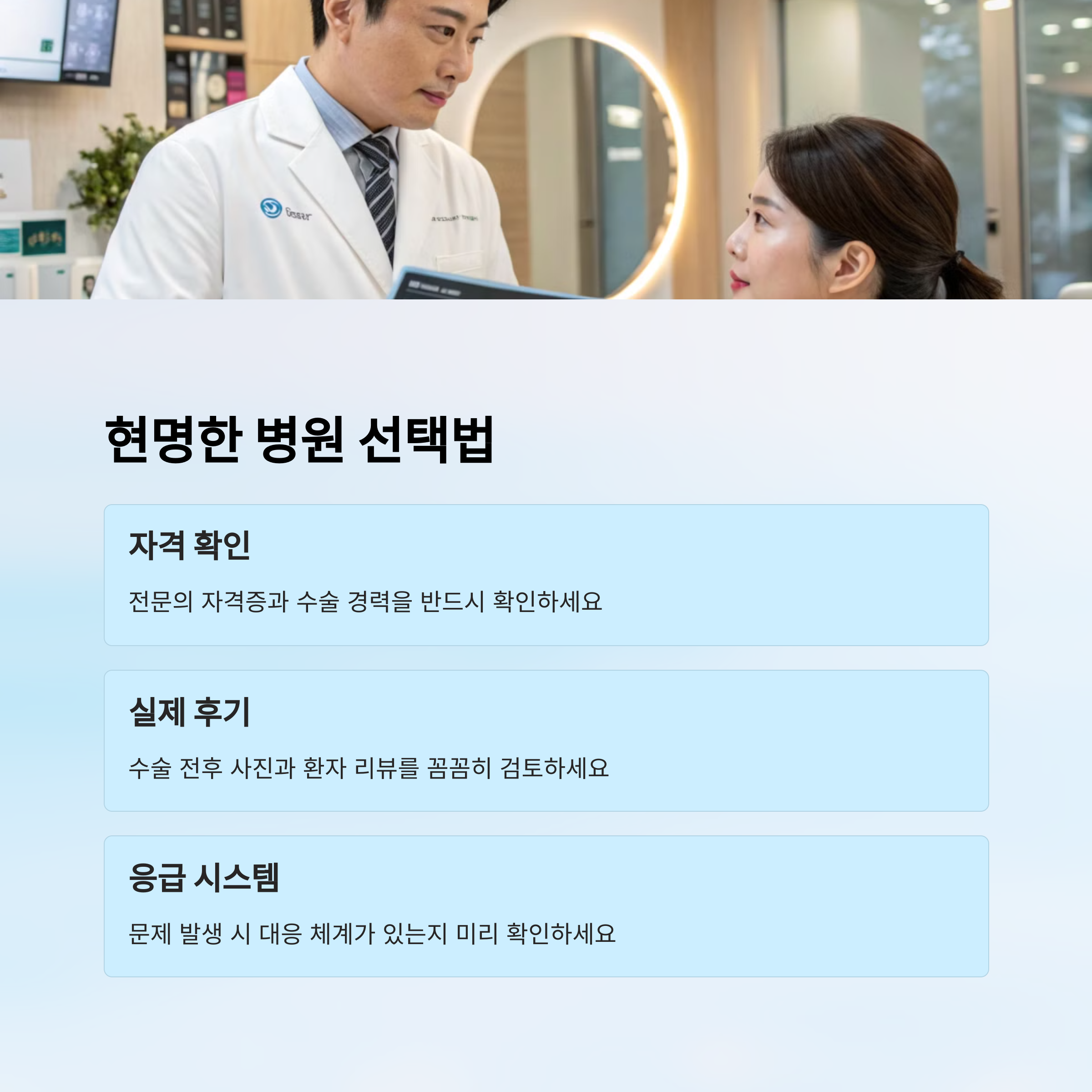 또한, 정기 검진 일정이 체계적으로 운영되는지도 확인해야 해요. 수술 후 1주 차, 1개월 차, 3개월 차 등 정기 검진이 포함된 병원을 선택하는 것이 안전해요.