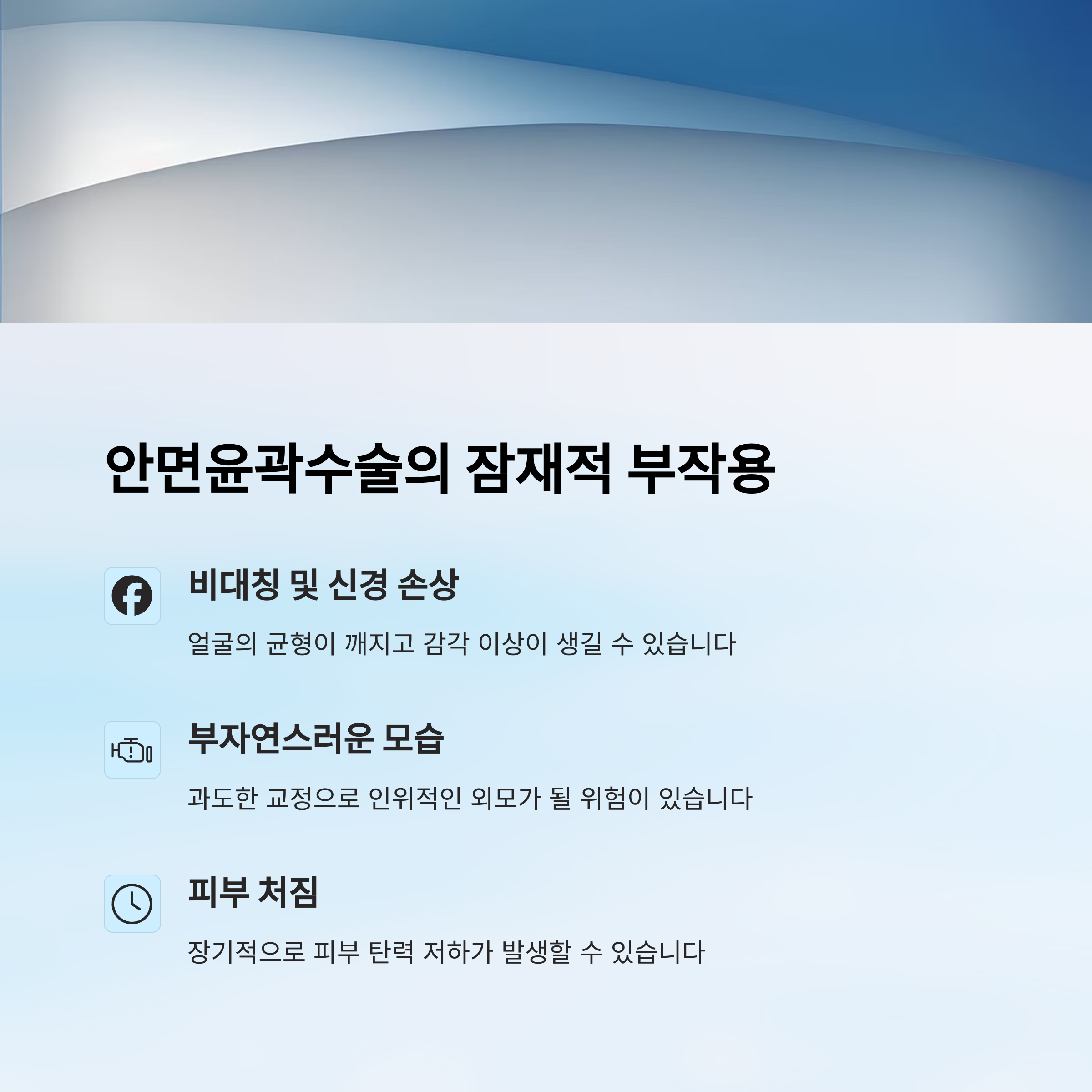 안면윤곽수술은 얼굴 뼈를 절제하거나 이동시키는 고난이도 수술이기 때문에 부작용 위험이 있어요. 특히 비대칭, 신경 손상, 출혈, 감각 저하 등이 대표적인 부작용으로 꼽혀요.