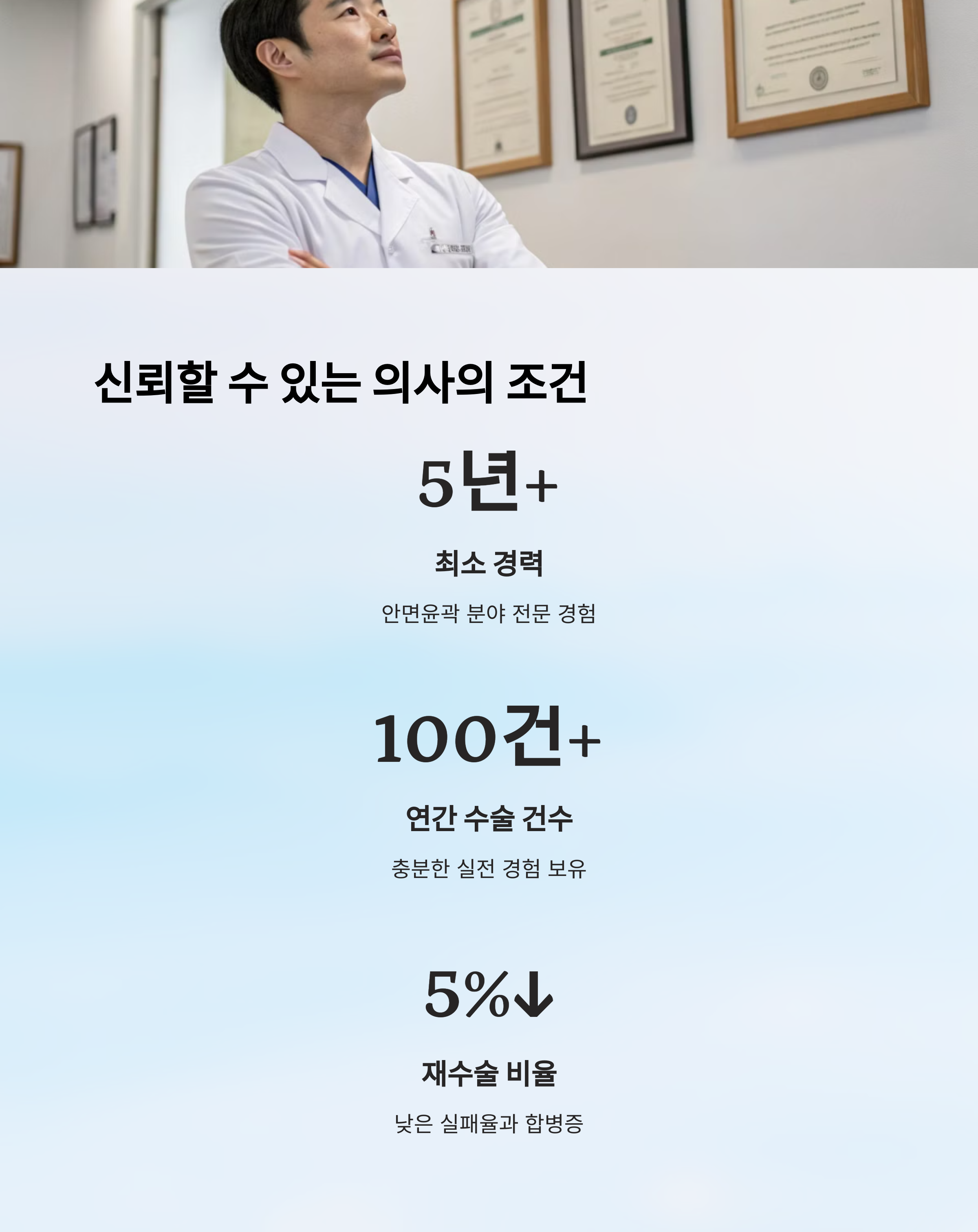 숙련된 전문의일수록 성공률이 높고 부작용 발생률이 낮아지는 걸 볼 수 있어요. 병원 선택 시 반드시 수술을 집도하는 의사의 경력을 확인하는 것이 중요해요!