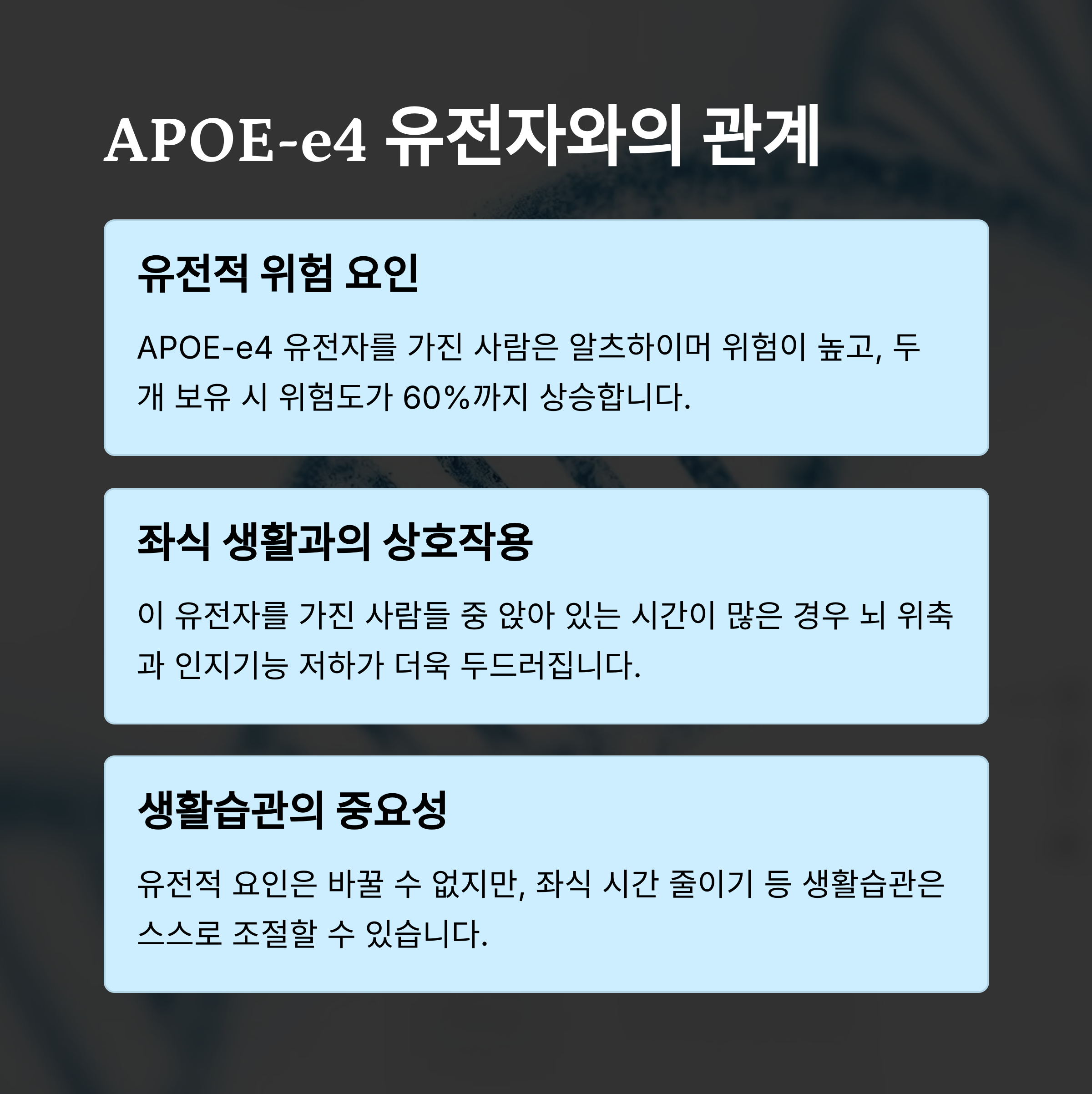 그런데 이번 연구에서는 이 APOE-e4 유전자를 가진 사람들 중에서도, 하루 중 앉아 있는 시간이 많은 사람들에게서 뇌 위축과 인지기능 저하가 더욱 두드러졌다는 사실이 밝혀졌어요. 쉽게 말해, 유전적으로도 위험한 상태에서 좌식 생활까지 더해지면 뇌 건강이 더욱 빠르게 악화된다는 거예요.