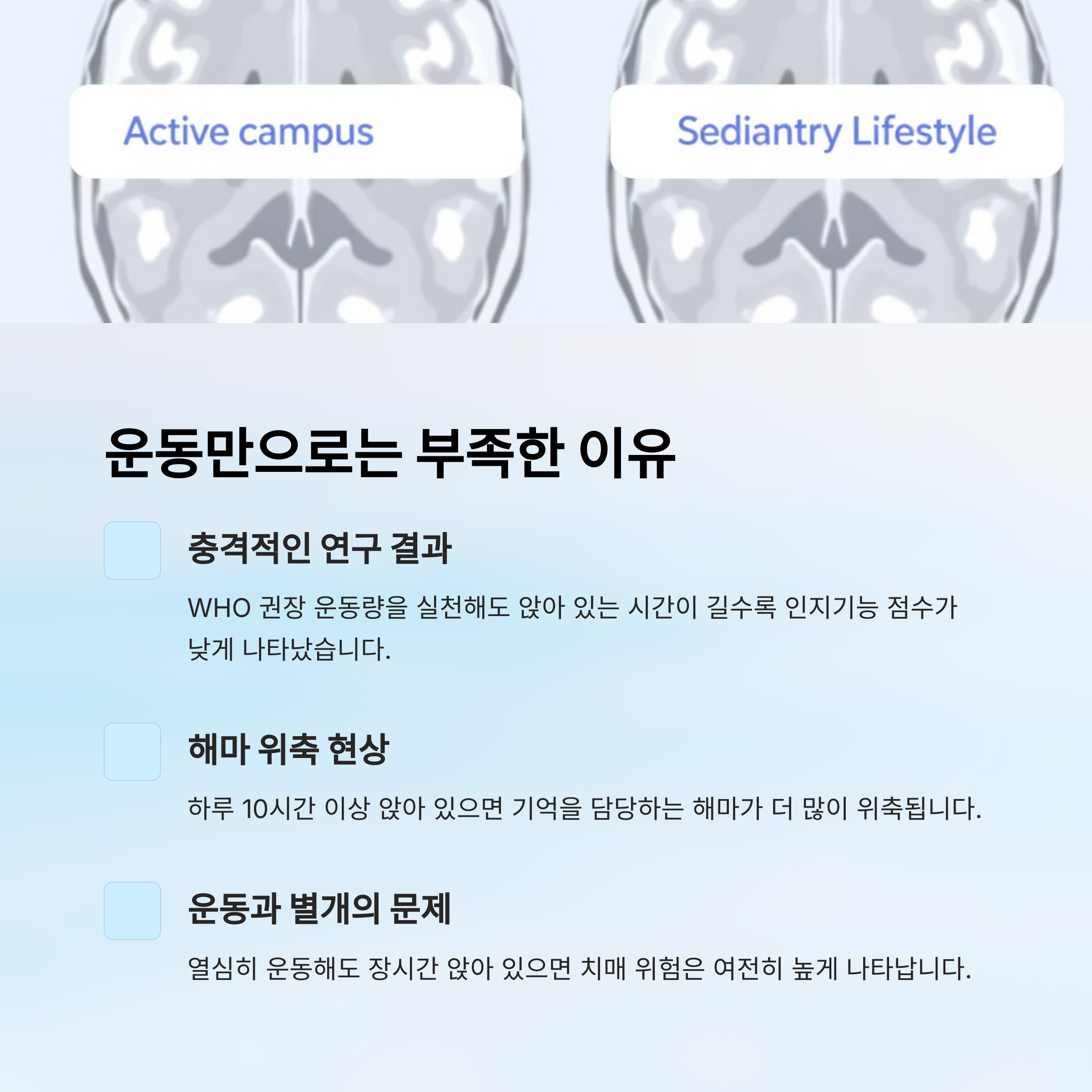 A7. 좌식 습관은 비만, 당뇨, 심혈관 질환, 혈액순환 장애까지 유발할 수 있어요. 뇌 건강뿐 아니라 전반적인 건강에 악영향을 주기 때문에 반드시 개선이 필요해요.