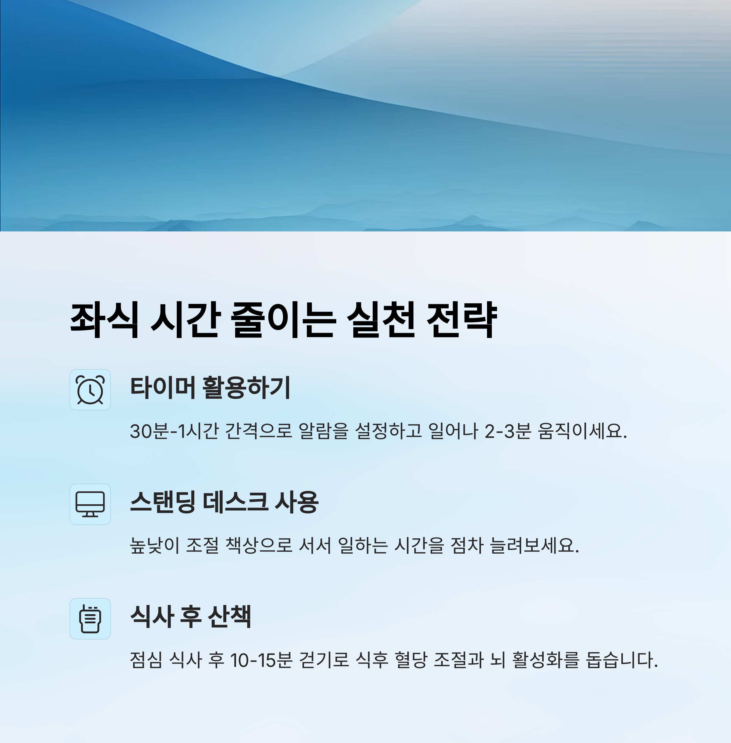 A2. 30분마다 2~3분 정도 일어나서 가볍게 걷거나 스트레칭하는 게 가장 간단하면서 효과적인 방법이에요. 타이머 알람을 활용하면 실천이 더 쉬워요.