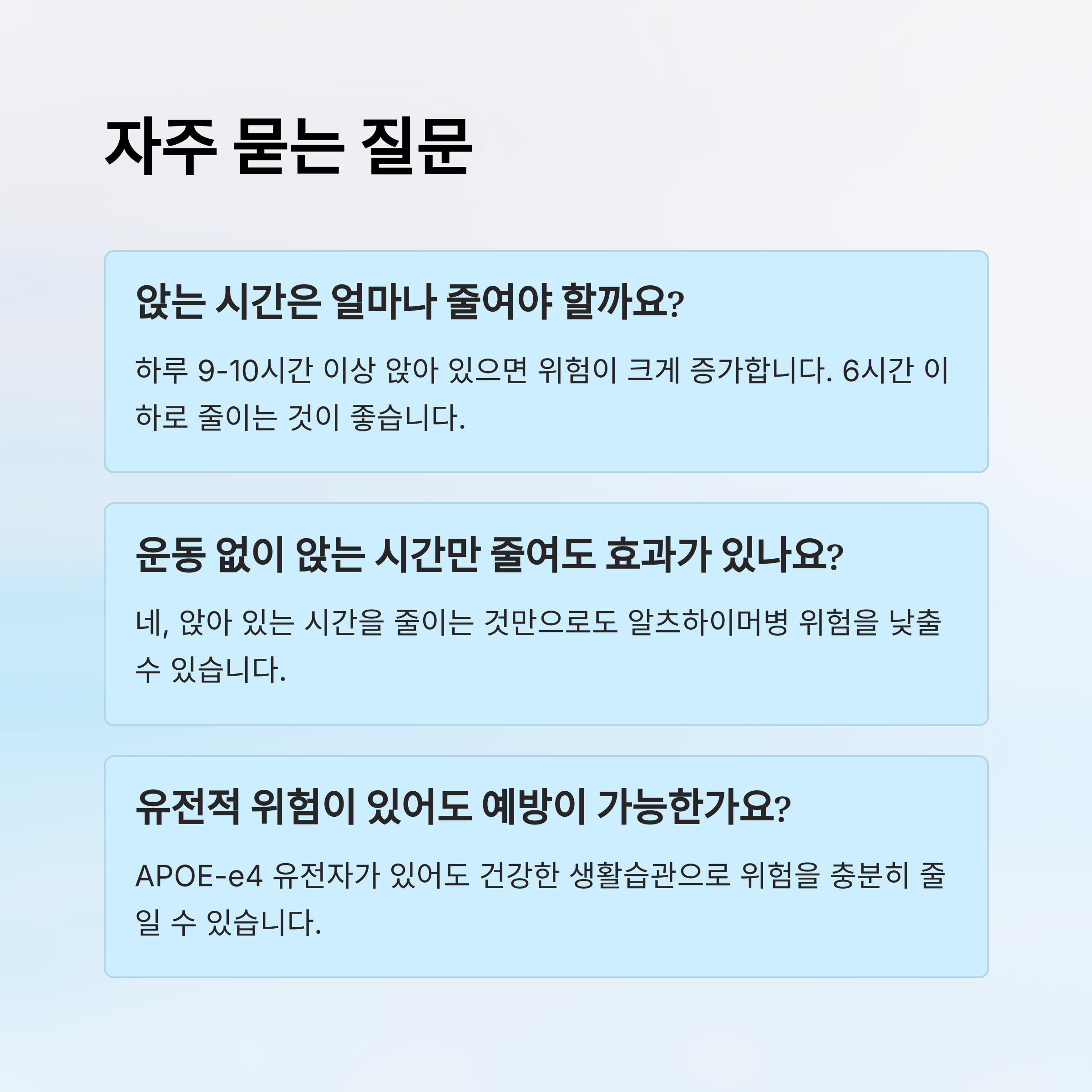 A5. 연구에 따르면 하루 9~10시간 이상 앉아 있는 사람들은 인지기능 저하와 해마 위축 위험이 크게 증가해요. 6시간 이하로 줄이는 걸 목표로 해보세요.